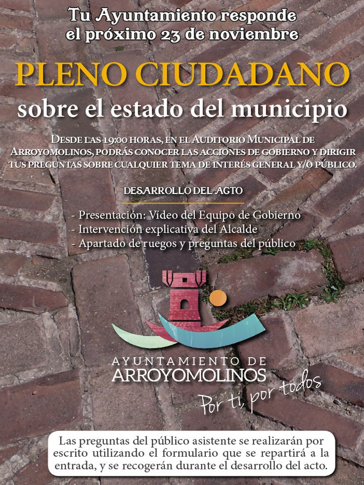 El próximo 23 de noviembre el Alcalde de Arroyomolinos, Carlos Ruipérez, y el Equipo de Gobierno expondrán y explicarán las principales Acciones de Gobierno en un Pleno Ciudadano en el Auditórium de Arroyomolinos. Los vecinos asistentes podrán realizar y plantear sus preguntas y dudas por escrito en unos formularios que se entregarán a la entrada del Auditórium de Arroyomolinos. Se priorizarán las preguntas de interés general e interés público que serán respondidas en dicho acto por el Alcalde y los concejales.