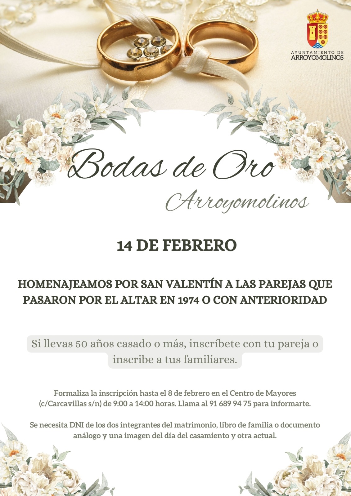 8 de enero de 2024.- El Ayuntamiento de Arroyomolinos organiza la primera edición de las bodas de oro para rendir homenaje a las parejas que residan en el municipio y que hayan contraído matrimonio en 1974 o con anterioridad a ese año en la localidad o fuera de ella.