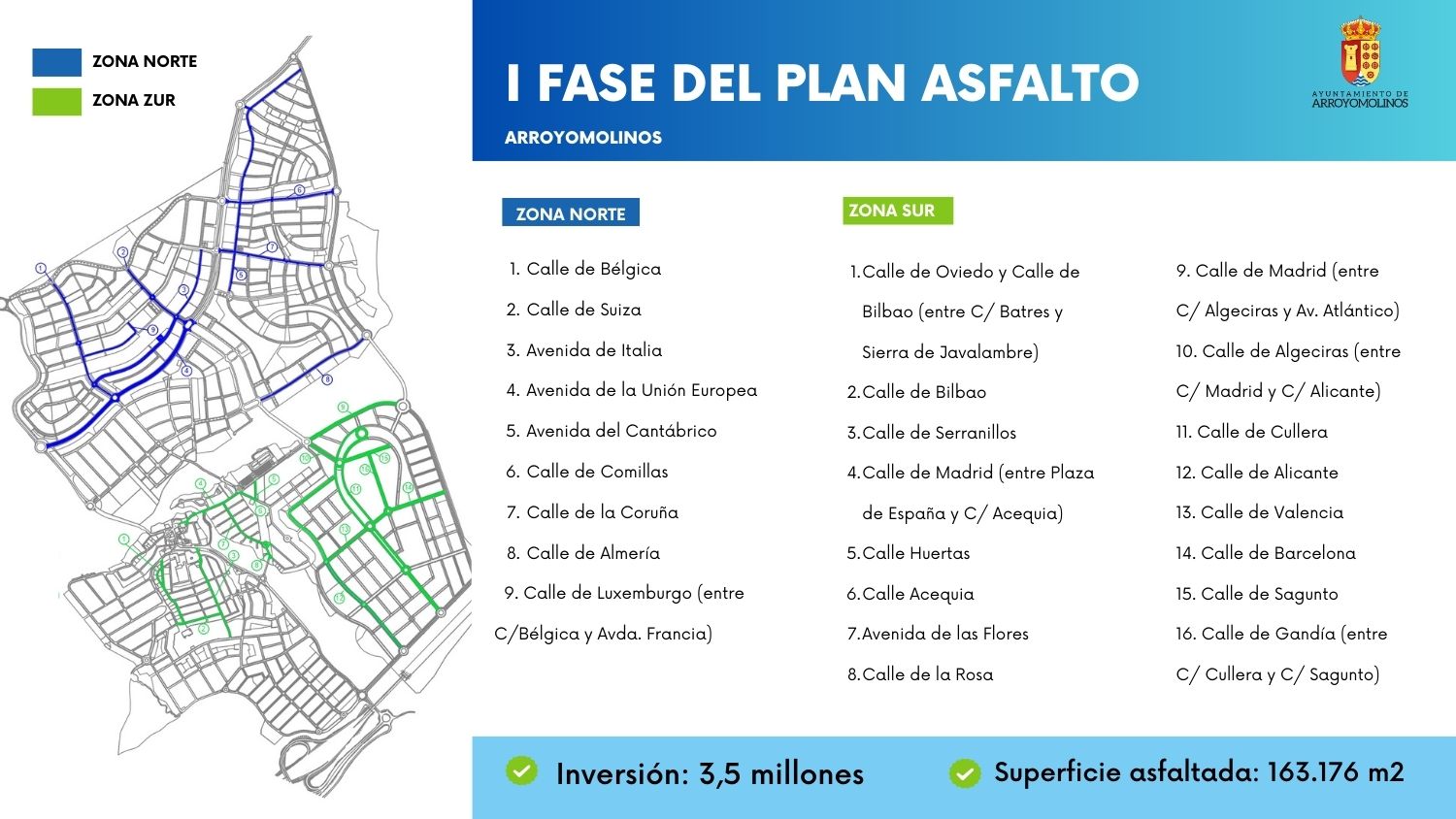 31 de julio de 2025.- La Junta de Gobierno del Ayuntamiento de Arroyomolinos ha aprobado hoy el expediente de licitación del contrato para la ejecución de los trabajos de la primera fase del 'plan Asfalto', que cuenta con un presupuesto de 3,5 millones de euros con el fin de actuar sobre una superficie de 163.176 metros cuadrados.