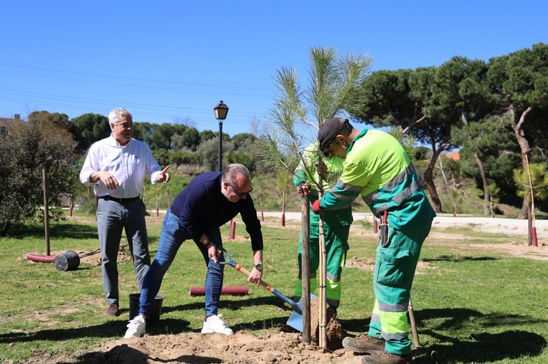 El alcalde de Arroyomolinos, Luis Quiroga, concejales del Gobierno municipal y el gerente de la empresa municipal, Alfonso Muñoz, han participado de forma simbólica en la reforestación del pinar, considerado como uno de los pulmones verdes del municipio, cuyo territorio protegido abarca más del 50 % de su superficie.