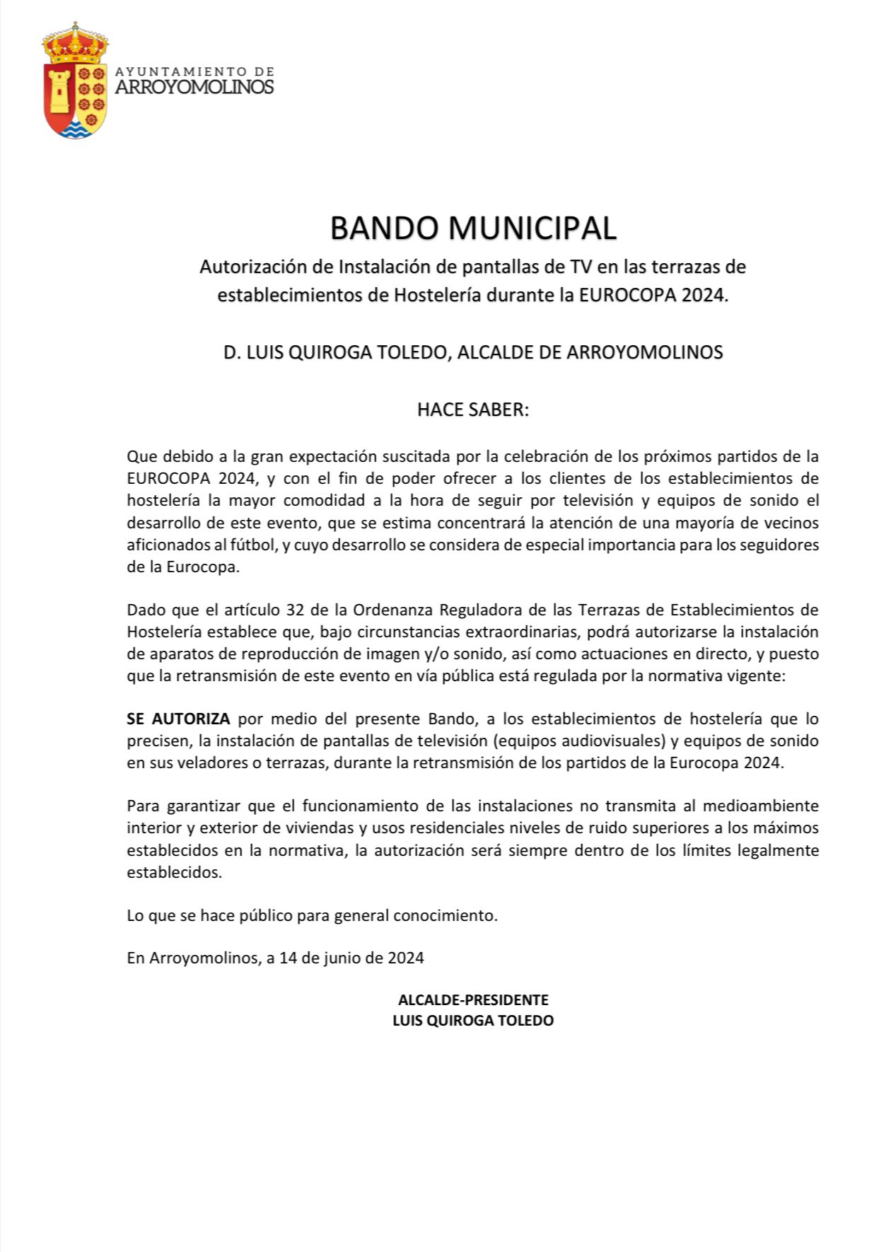 El alcalde de Arroyomolinos, Luis Quiroga, ha dictado un bando en el que autoriza la instalación de pantallas de televisión en las terrazas de los establecimientos hosteleros durante los encuentros de fútbol que se disputen en el marco de la Eurocopa.