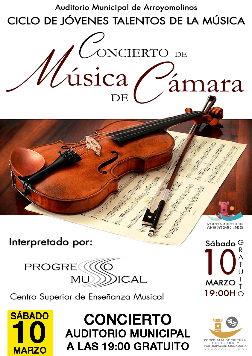 Una vez más el Auditórium de Arroyomolinos acoge una cita musical de gran altura. En esta ocasión serán los más jóvenes quienes se suban al escenario del Auditórium con un Concierto de Música de Cámara. Una cita de gran nivel musical con el “Ciclo de Jóvenes Talentos de la Música” del Centro Superior de Enseñanza Musical Progreso Musical.