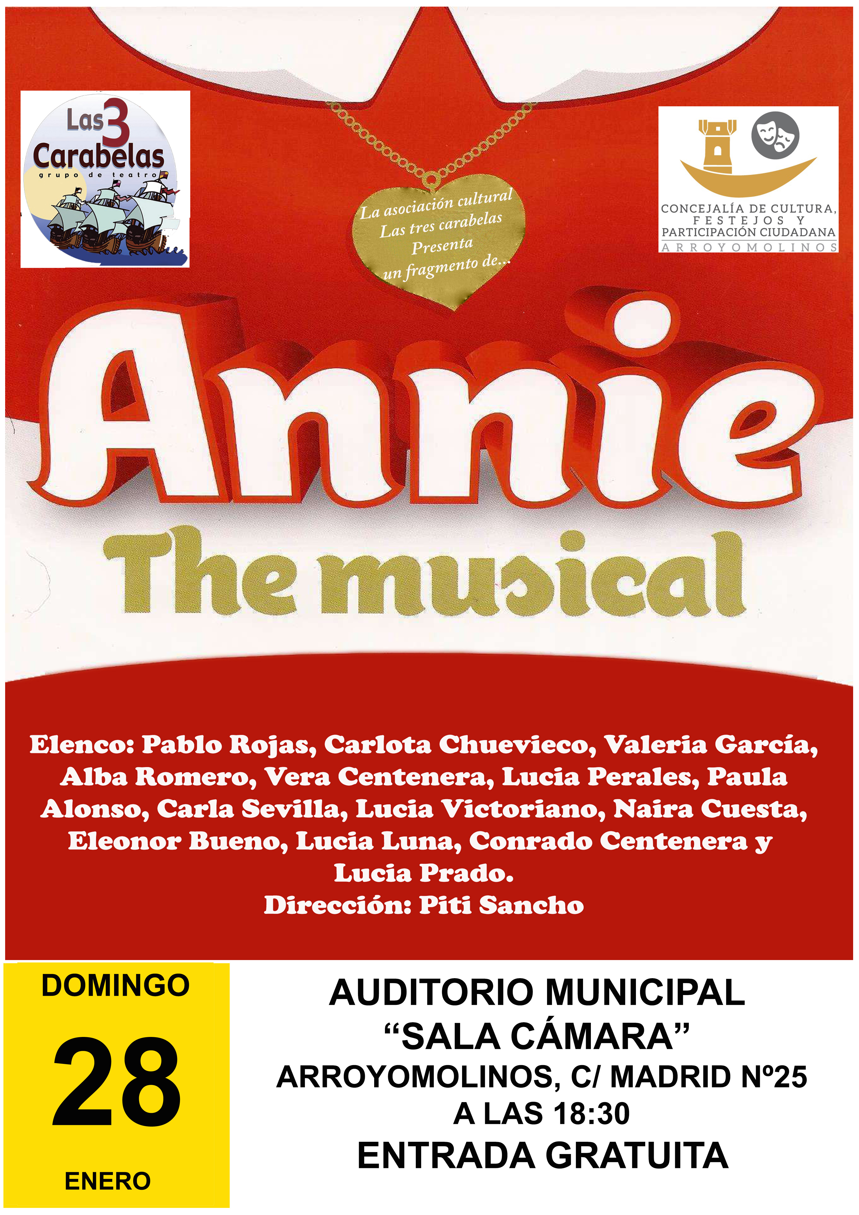 Las artes escénicas no tienen edad. Y esta aseveración se va a demostrar gracias a los más jóvenes de Arroyomolinos. El próximo domingo 28 de enero en la sala de cámara del Auditórium de Arroyomolinos 15 niños y niñas de, entre 4 y 13 años, llevaran a cabo un ensayo general de “Annie the musical” Todos ellos son alumnos de la Asociación las 3 Carabelas