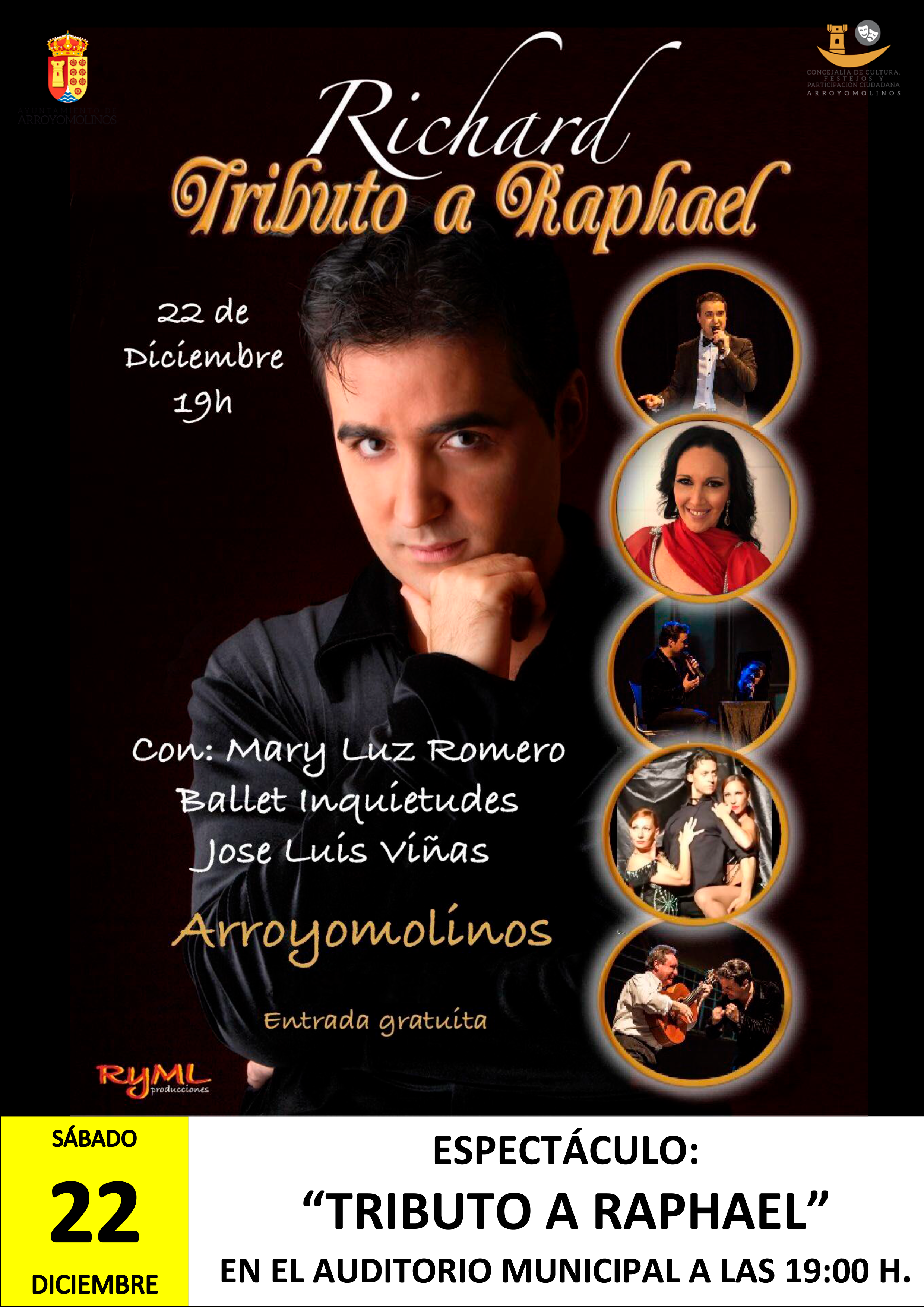 El próximo 22 de diciembre el Auditorio de Arroyomolinos acogerá el espectáculo “Richard. Tributo a Raphael” En el escenario estará acompañado por Mary Luz Romero, el Ballet Inquietudes y José Luis Viñas. Entrada gratuita y libre hasta completar aforo.