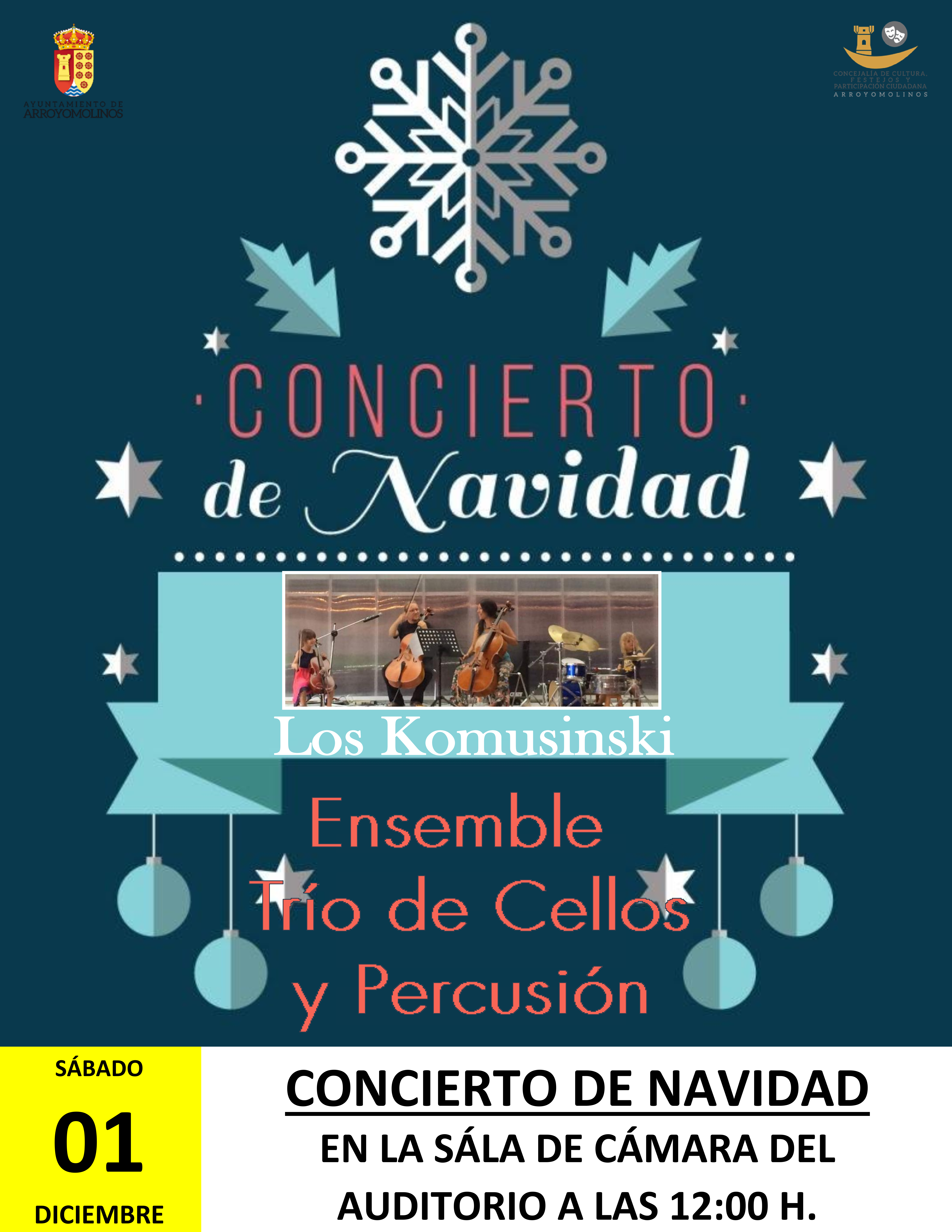 Instrumentos de cuerda y percusión estarán en la Sala de Cámara del Auditorio de Arroyomolinos para dar inicio a la Navidad en nuestra localidad. Un trío de cellos y la percusión se unirán gracias a los Komusinski para envolver Arroyomolinos de música navideña y grandes clásicos.