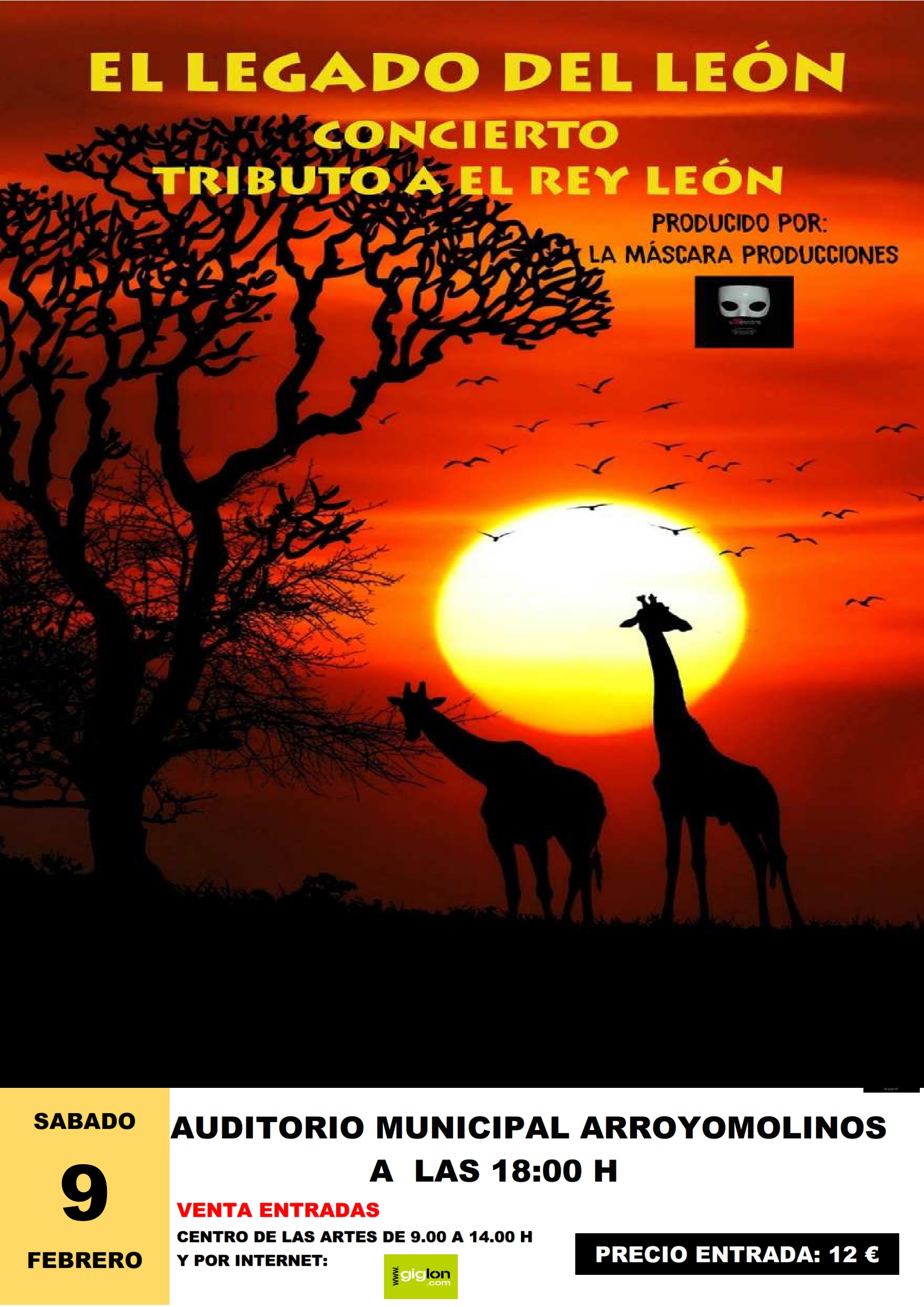 La universal historia de “El Rey León” llega a Arroyomolinos en forma de musical, con el tributo que realiza La Máscara Producciones. La sabana africana es el escenario en el que tienen lugar las aventuras de Simba. Él es el heredero al trono hasta que el malvado Scar le acusa injustamente de la muerte de su padre y es desterrado.