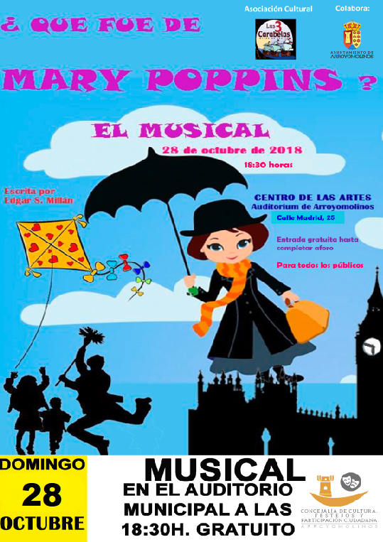 La Asociación de Teatro las 3 Carabelas nos invita a disfrutar de las míticas canciones de Mary Poppins en una historia renovada y donde las segundas ilusiones y los nuevos proyectos nos ponen de relieve que siempre existe un volver a empezar. En el escenario contaremos con siete actores interpretando este musical.