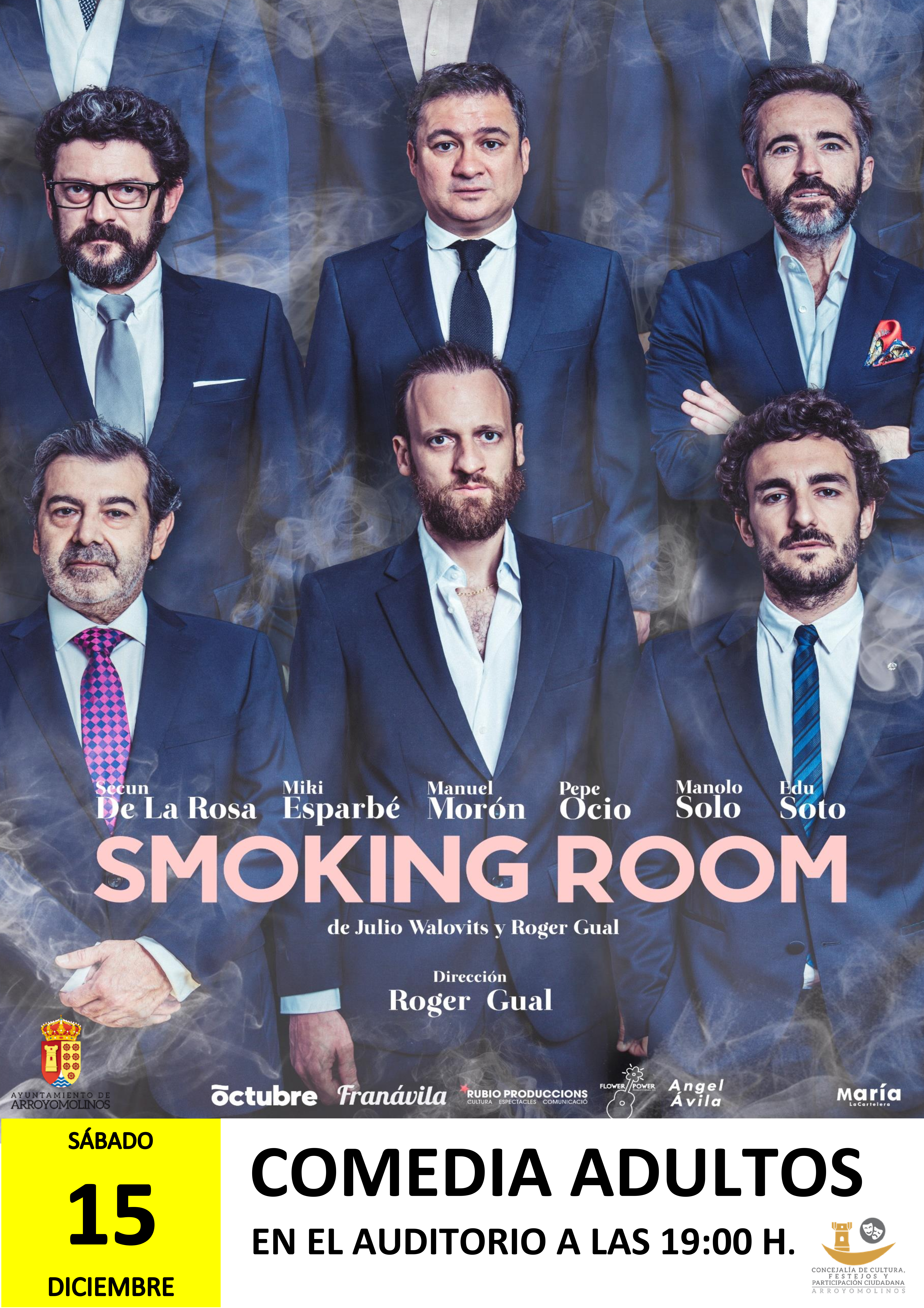 Desde las 19:00 horas del sábado 15 de diciembre el Auditorio de Arroyomolinos acoge la representación teatral de “Smoking Room”. En el elenco Secún de la Rosa, Canco Rodríguez, Carlos Chamarro, Pepe Ocio, Nico Romero, Fele G. Velez. Venta de entradas en giglon.com o en el Auditorio.