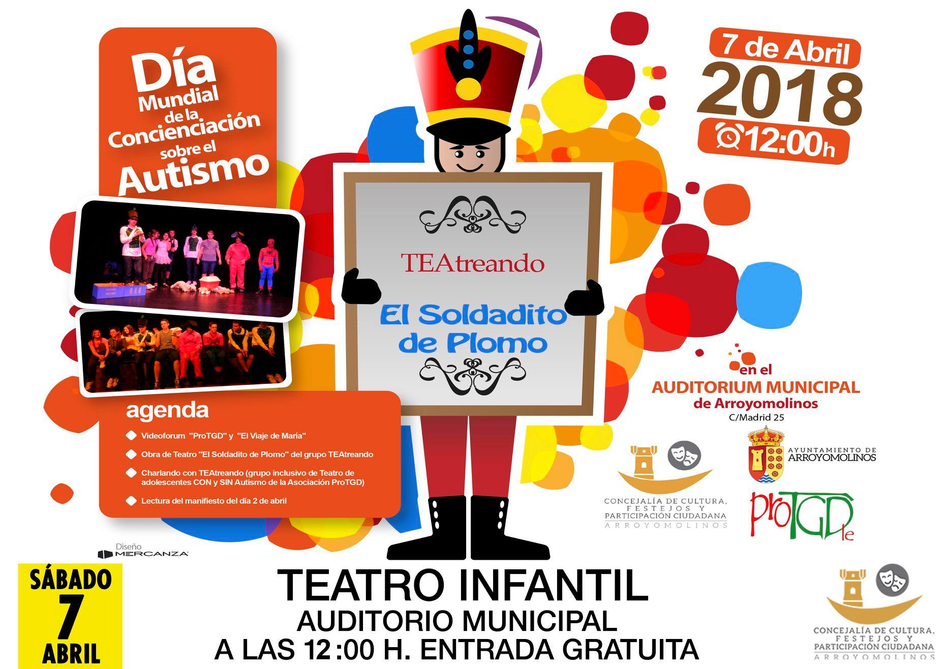 Tras seis meses de duro trabajo, ensayos, elaboración de vestuarios y escenografía llegan con la obra “El Soldadito de Plomo” hasta nuestra ciudad. Esta obra de teatro busca concienciar y sensibilizar sobre el autismo, con motivo del Día Mundial del Autismo. El sábado 7 de abril desde las 12:00 del mediodía estarán en el Auditórium de Arroyomolinos. Un espectáculo teatral para todos los públicos.