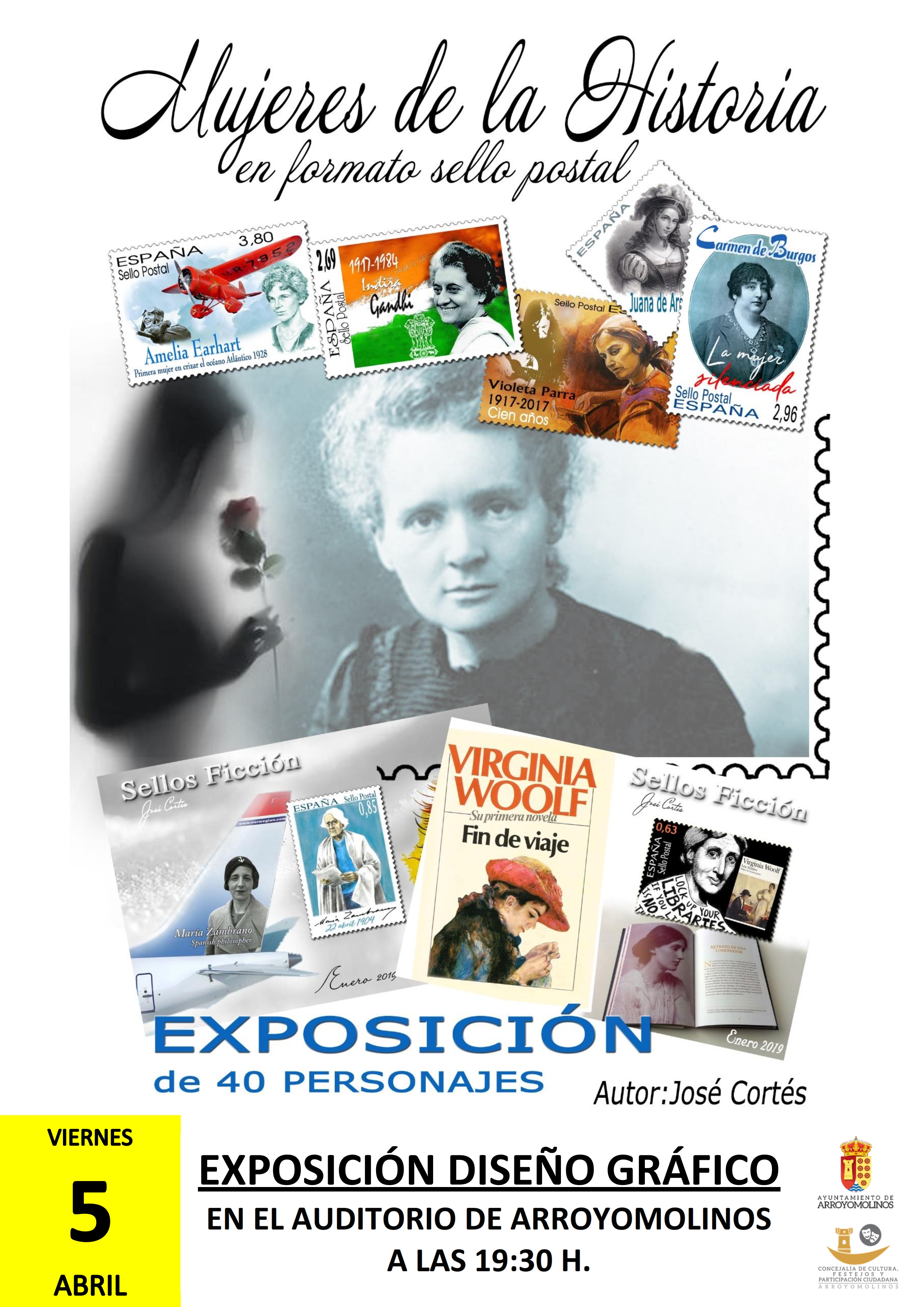 José Cortes llega al Auditorio de Arroyomolinos con una interesante exposición sobre diseño gráfico: Mujeres de la Historia en formato de sello postal. Una importante muestra de 40 personajes con la que deleitarnos con ilustres mujeres que marcaron un antes y un después en la historia universal. Virginia Woolf, Juana de Arco, Carmen de Burgos o Violeta Parra como ejemplos de una de las exhibiciones más atrayentes que ha albergado nuestro Auditorio.