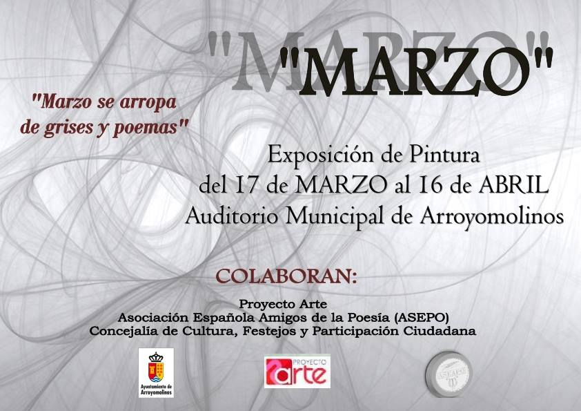 A partir del 17 de marzo a las 20:30h., abre sus puertas en el Auditorio Municipal de Arroyomolinos la exposición de pintura "Marzo se arropa de grises y poemas" de Proyecto Arte, con la colaboración de la Asociación Española de amigos de la Poesía (ASEPO).