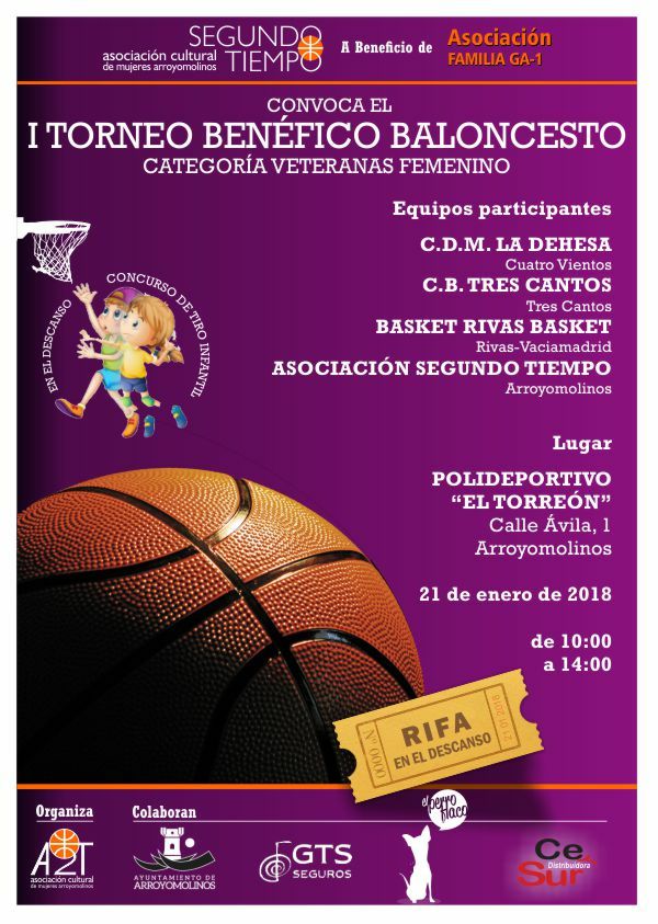 El polideportivo “El Torreón” será testigo del I Torneo Benéfico de Baloncesto en categoría veteranas femenino. Organizado por la Asociación Cultural de Mujeres de Arroyomolinos Segundo Tiempo a beneficio de la Asociación GA-1.