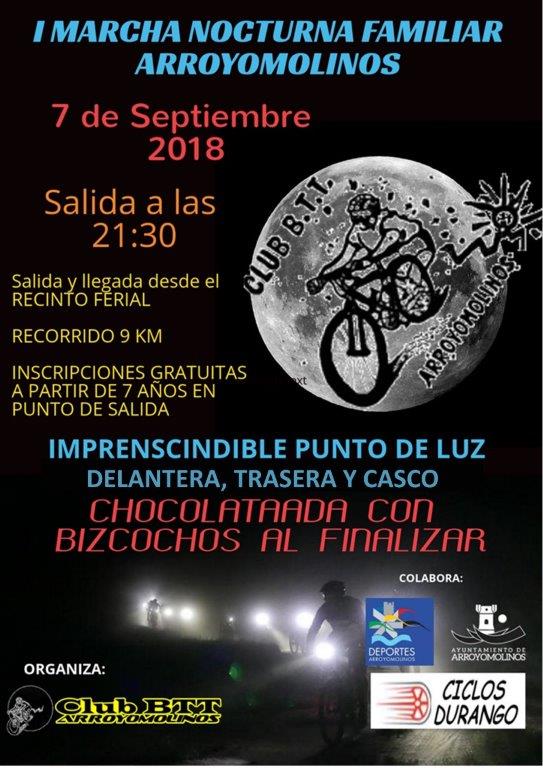 Este viernes el ciclismo se práctica de noche en Arroyomolinos. Una cita dirigida a público familiar donde los más jóvenes y sus familiares podrán practicar deporte juntos. Se recorrerán 9 kilómetros que discurrirán en el entorno de Arroyomolinos, principalmente en el carril bici y en la vía pecuaria. Para acabar la fiesta ciclista en familia se realizará una chocolatada con bizcochos para todos los participantes al acabar el evento. Se contará con bollería para celiacos.