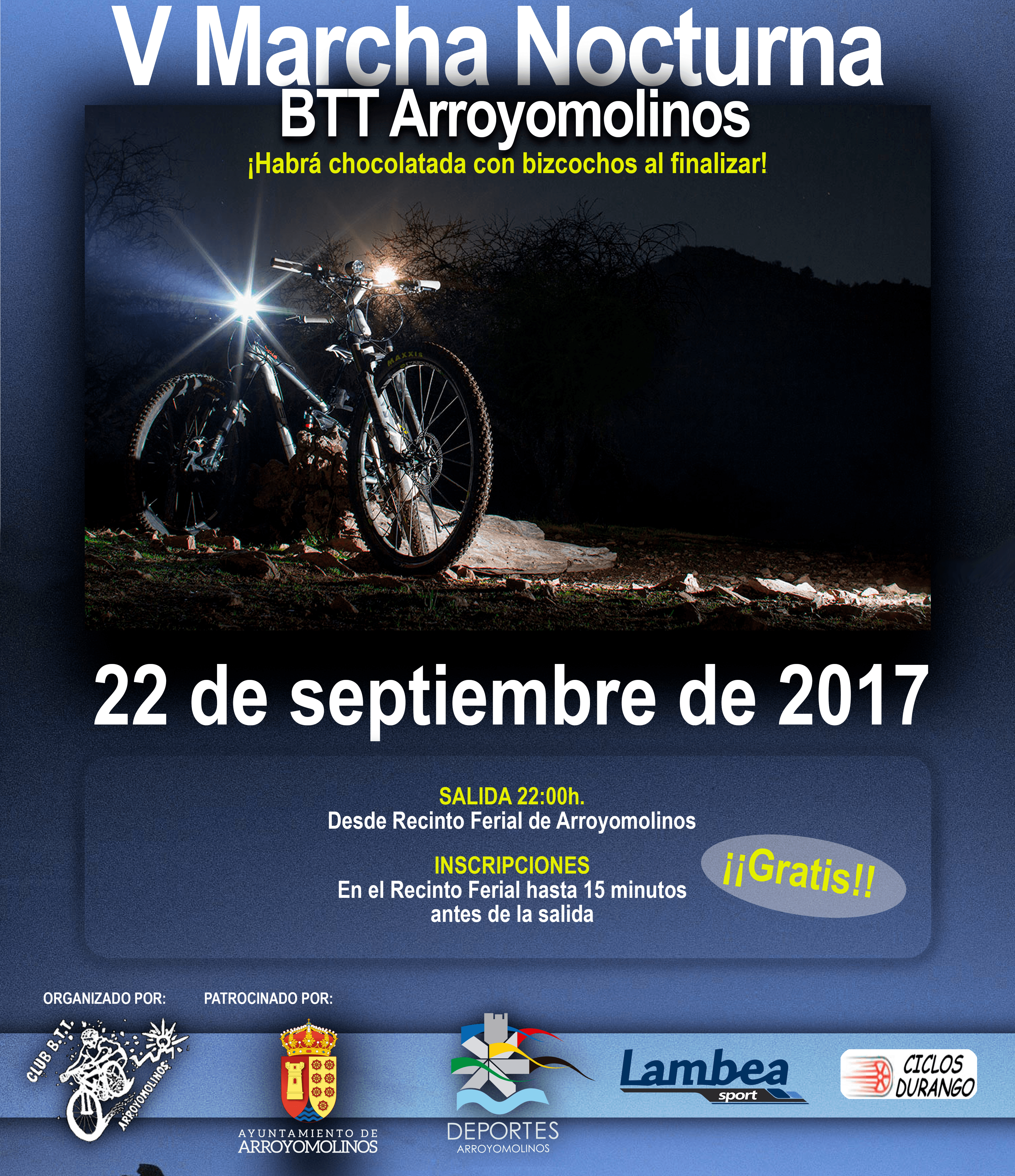 La salida será a las 22:00 de la noche del próximo 22 de septiembre desde el Recinto Ferial de Arroyomolinos. Al finalizar la prueba disfrutaremos de chocolatada con bizcochos.