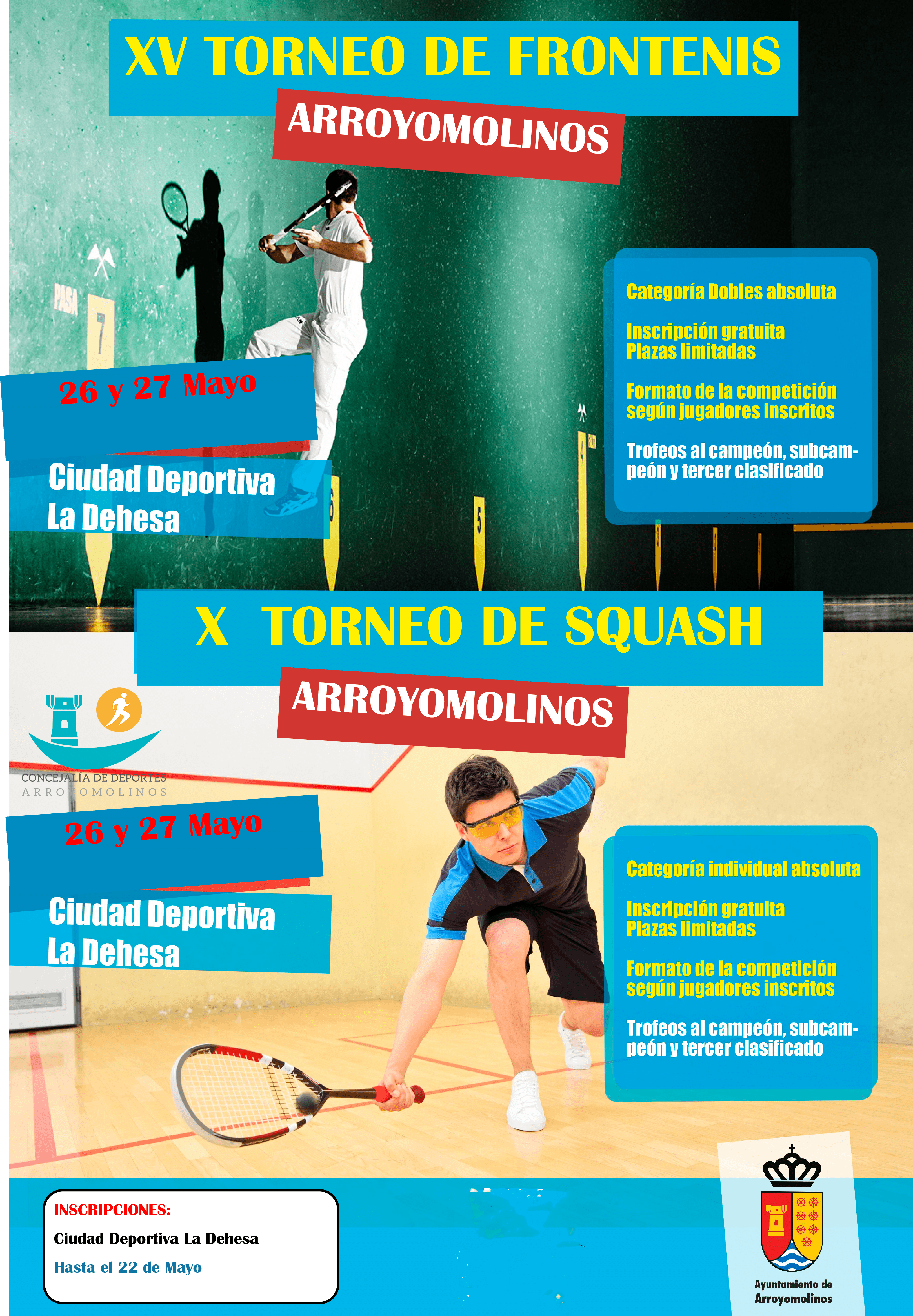 La cita con squash y con el frontenis tendrá lugar el 26 y 27 de mayo en la Ciudad Deportiva La Dehesa de Arroyomolinos. Las competiciones comienzan a las 9 de la mañana.