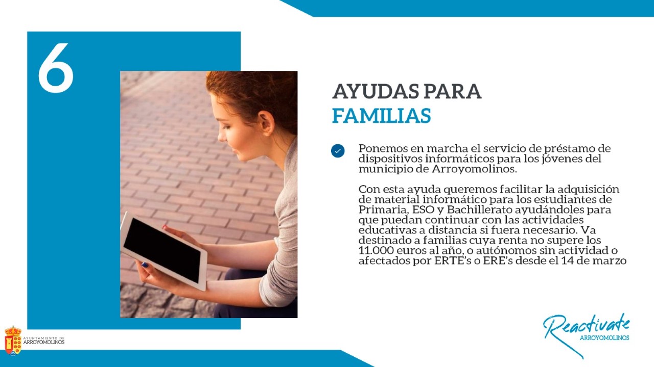 Esta medida está incluida en el PLAN REACTÍVATE ARROYOMOLINOS puesto en marcha el pasado mes de mayo con el fin de permitir la reactivación tanto económica como social de la localidad. Comprende iniciativas sociales y de apoyo a las familias, además de otras de índole económica para apoyar a autónomos, comercios y pequeños y medianos empresarios de Arroyomolinos. El plan tiene una dotación de inicial de 1,5 millones de euros.