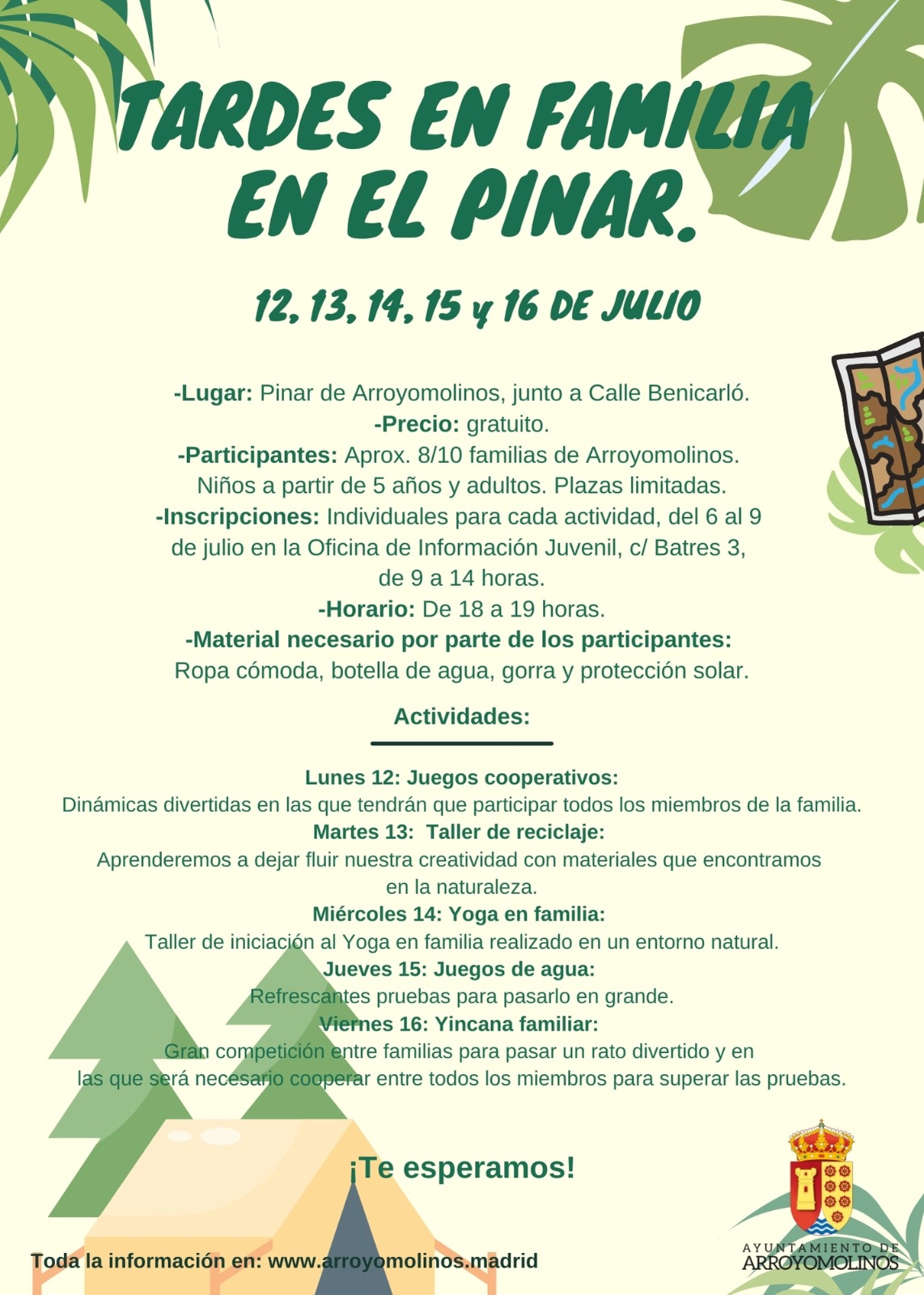 El Ayuntamiento de Arroyomolinos pone en marcha una nueva iniciativa con actividades orientadas a las familias del municipio. Se trata del programa Tardes en Familia, que se desarrollarán en el Pinar.