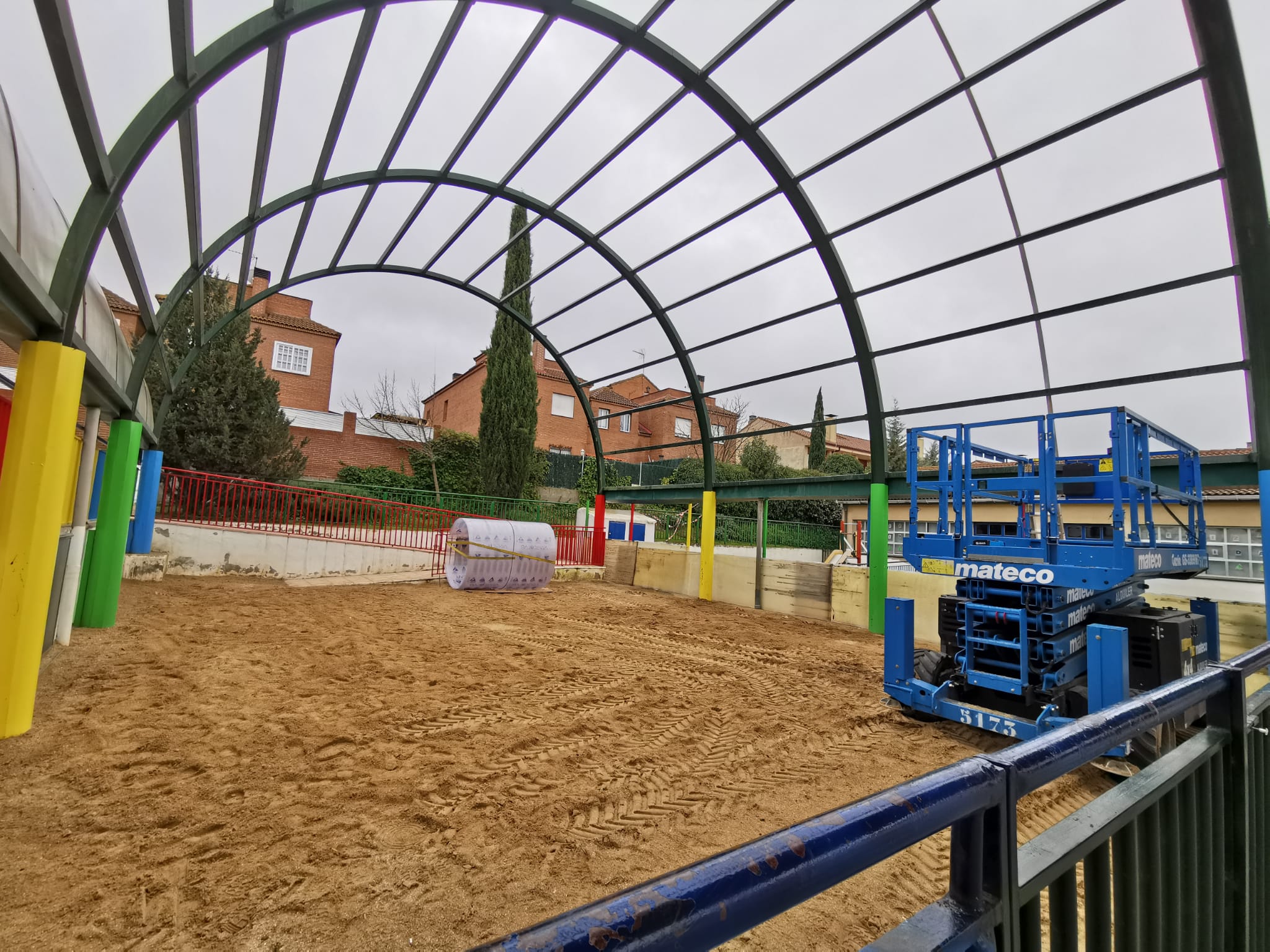 El primero de los trabajos que se está acometiendo es la sustitución de dos cubiertas con forma de bóveda, que cubren determinados espacios del patio de Educación Infantil del colegio. Estos elementos permiten la salida de los alumnos al exterior los días de lluvia, y los protegen del sol los días despejados. Ambos han perdido su resistencia y estabilidad original, con motivo del paso del tiempo y la exposición a las inclemencias del tiempo.