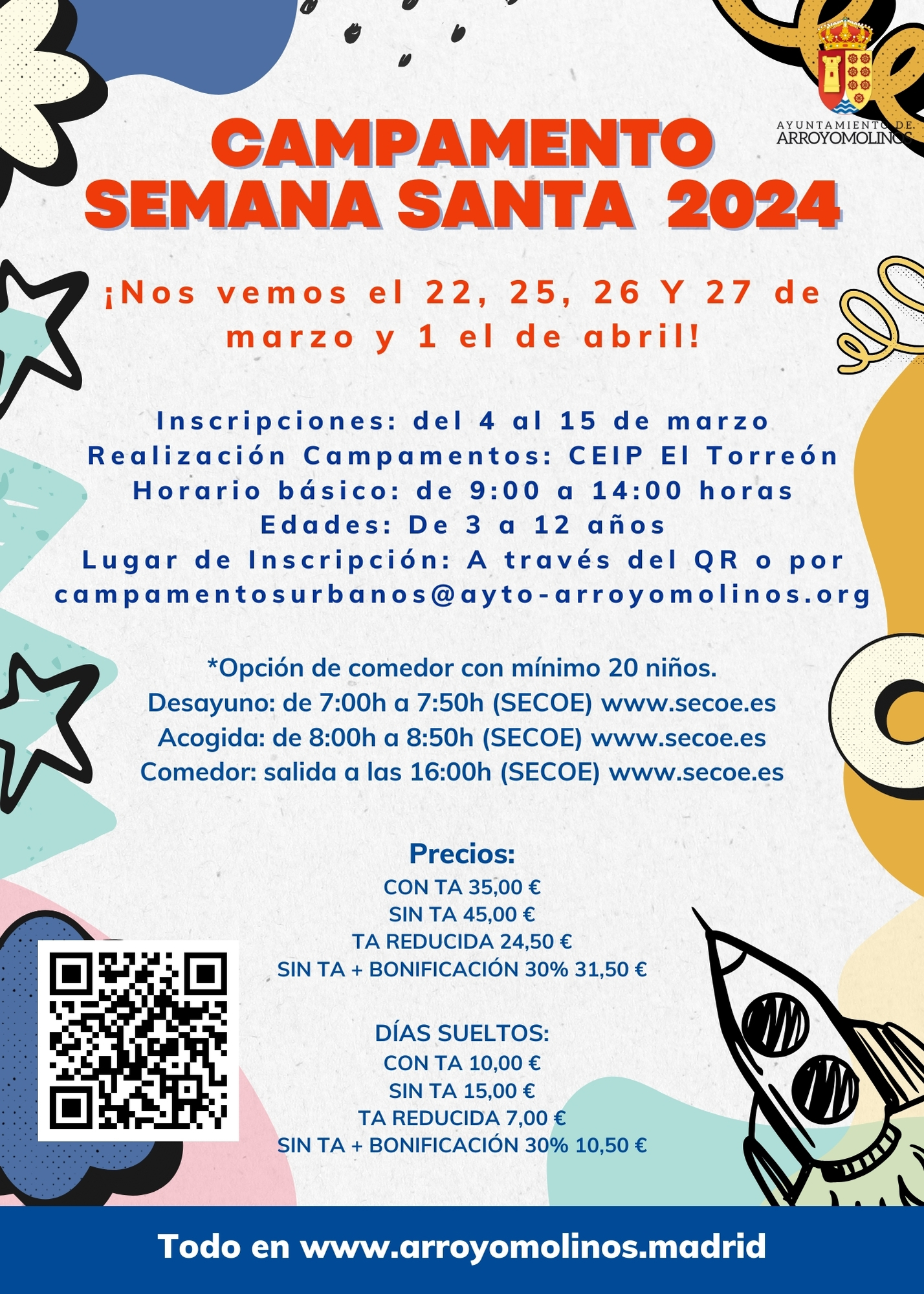 El Ayuntamiento de Arroyomolinos habilita entre el 4 y el 15 de marzo el correo electrónico campamentosurbanos@ayto-arroyomolinos.org para inscribir a los pequeños y para resolver dudas que surjan entre las familias.