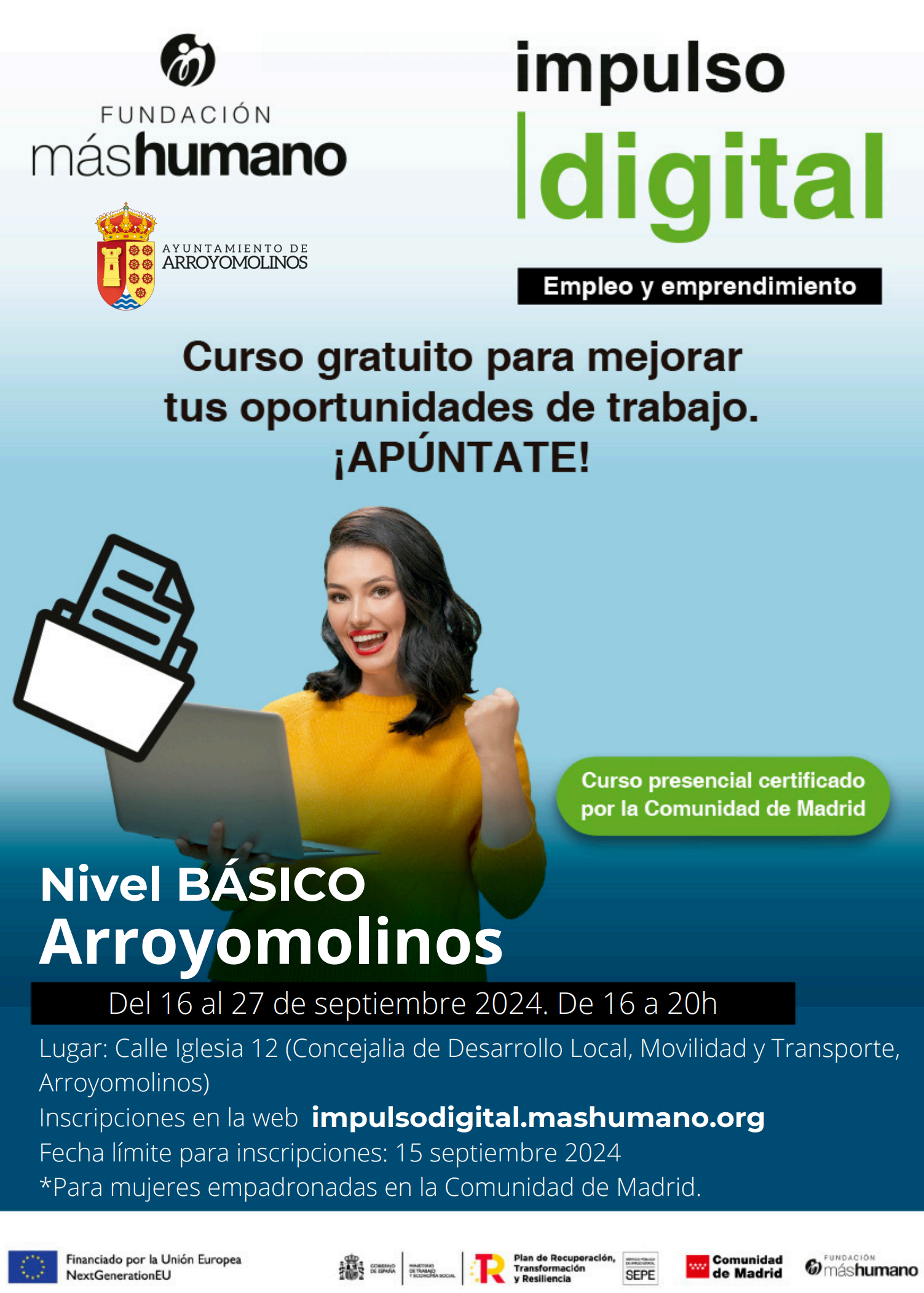 Vuelve a Arroyomolinos el programa formativo Impulso Digital, diseñado para capacitar a mujeres en habilidades digitales esenciales para su éxito profesional y en colaboración con la ´Fundación más humano´.