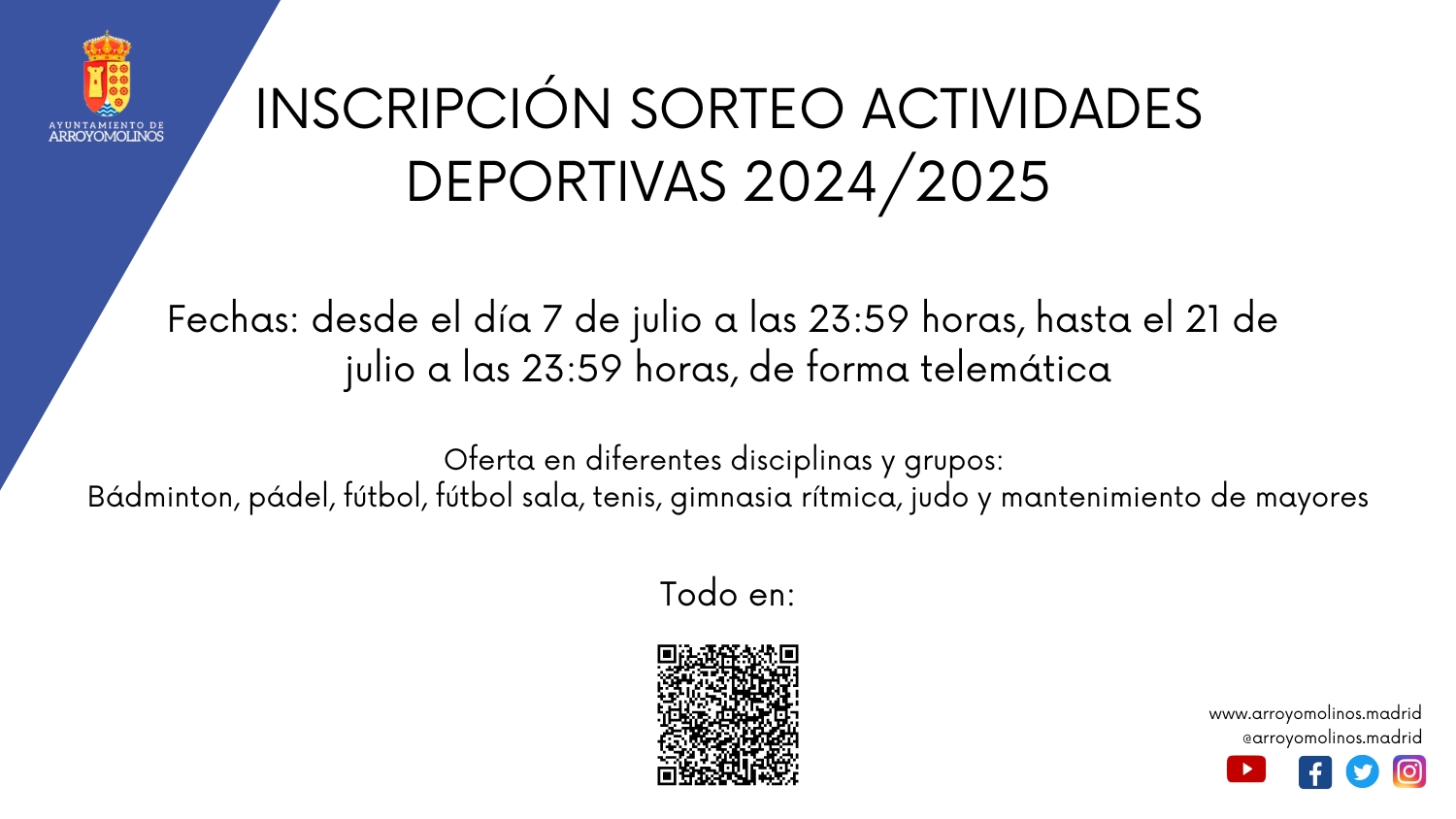 - Se cumplimenta el formulario telemáticamente a través de la sede electrónica. Para acceder deben de ir a Registro Telemático del Ayuntamiento de Arroyomolinos/Catálogo de Trámites/Deportes/“INSCRIPCIÓN SORTEO ACTIVIDADES DEPORTIVAS 2024/2025”.