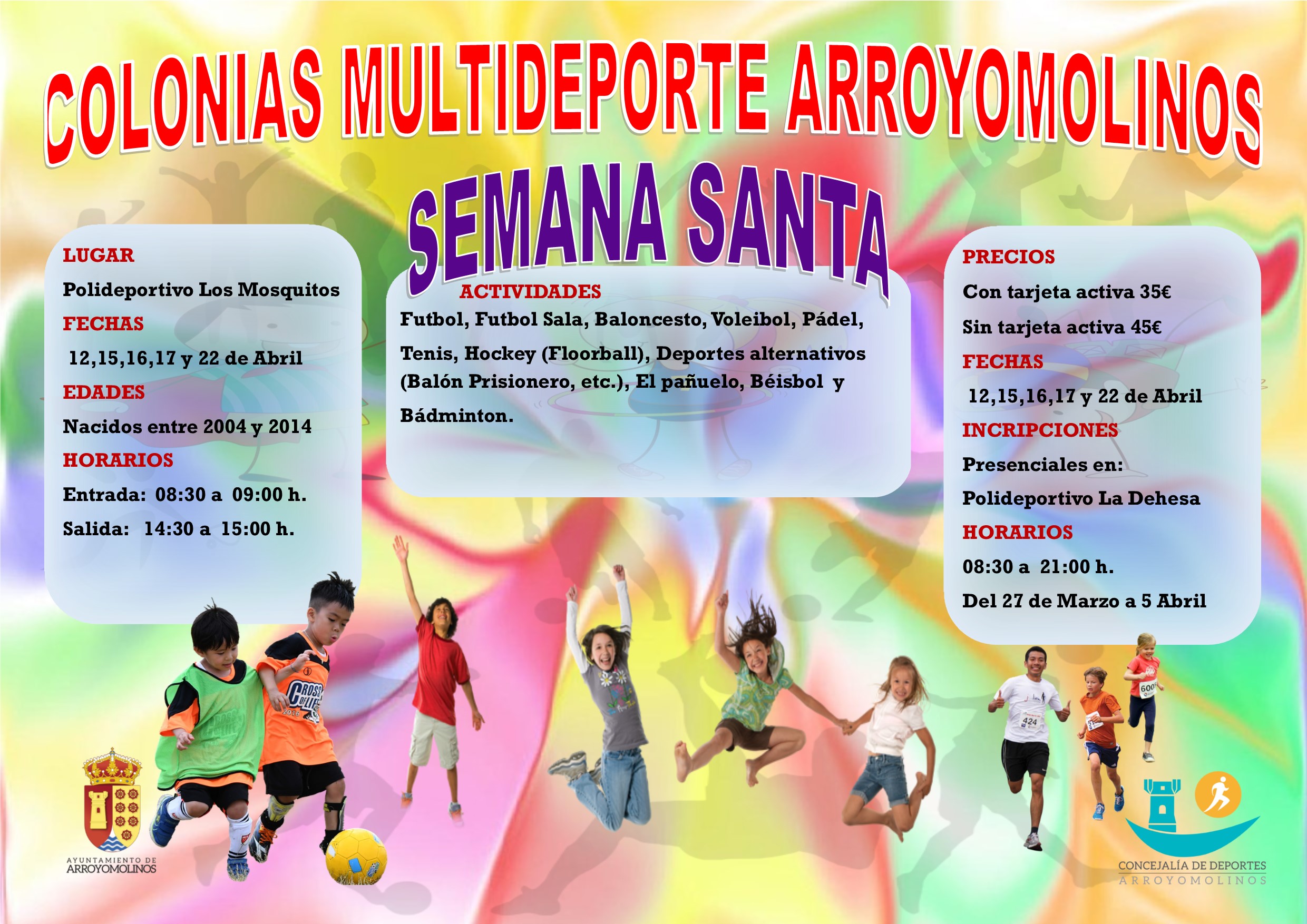 La Semana Santa se acerca y las familias arroyomolinenses vuelven a tratar de adaptar las vacaciones escolares con las vacaciones laborales. Una difícil tarea a la que tienen que hacer frente una vez más. El Ayuntamiento de Arroyomolinos se afana una vez más en dar alternativas a las familias de Arroyomolinos y, desde la Concejalía de Deportes, se impulsa este programa de colonias urbanas donde el deporte será el gran protagonista.