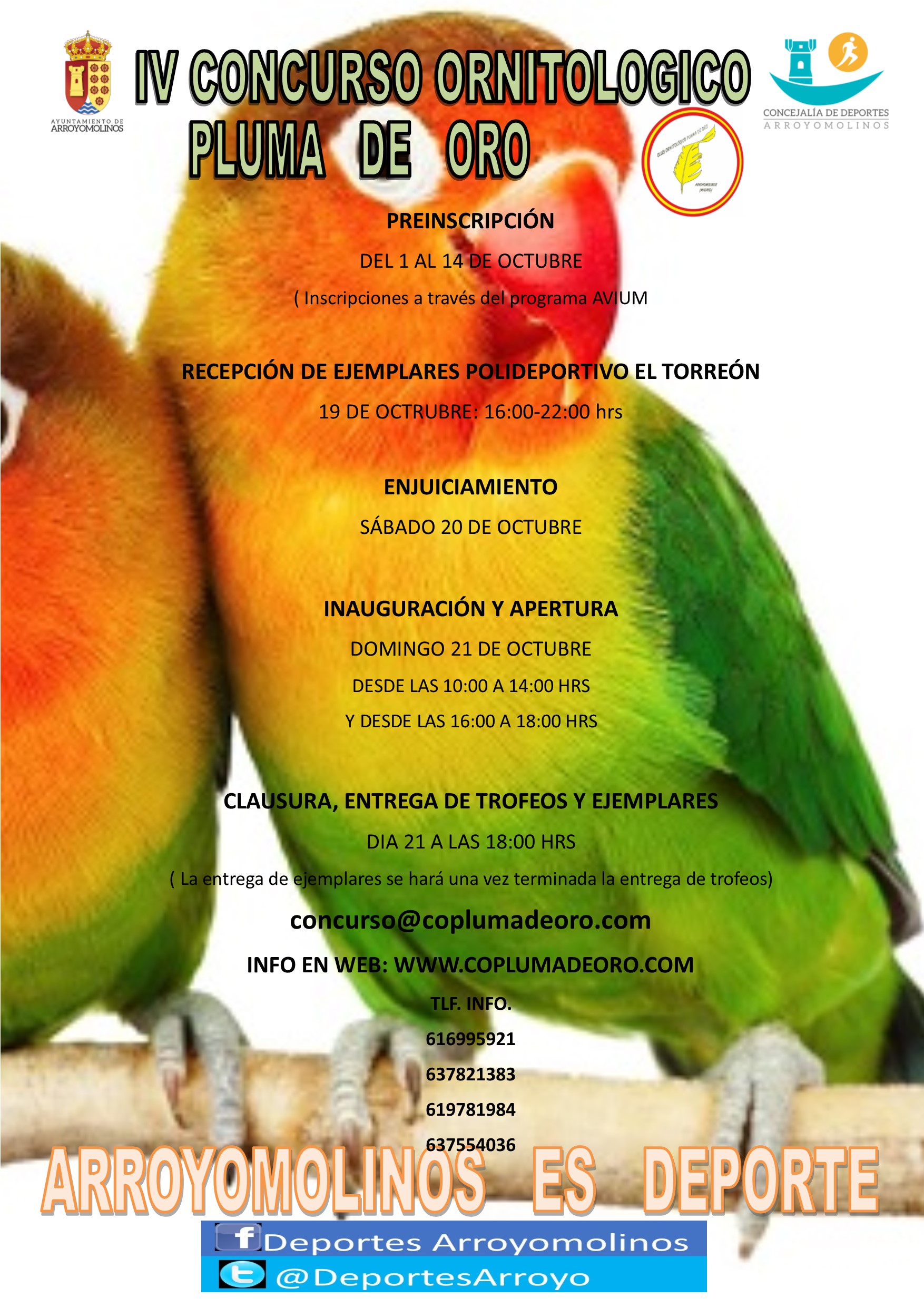 El domingo desde las 10:00 de la mañana comienza el IV Concurso Ornitológico Pluma de Oro de Arroyomolinos. Una cita que se celebrará en el Polideportivo El Torreón.
