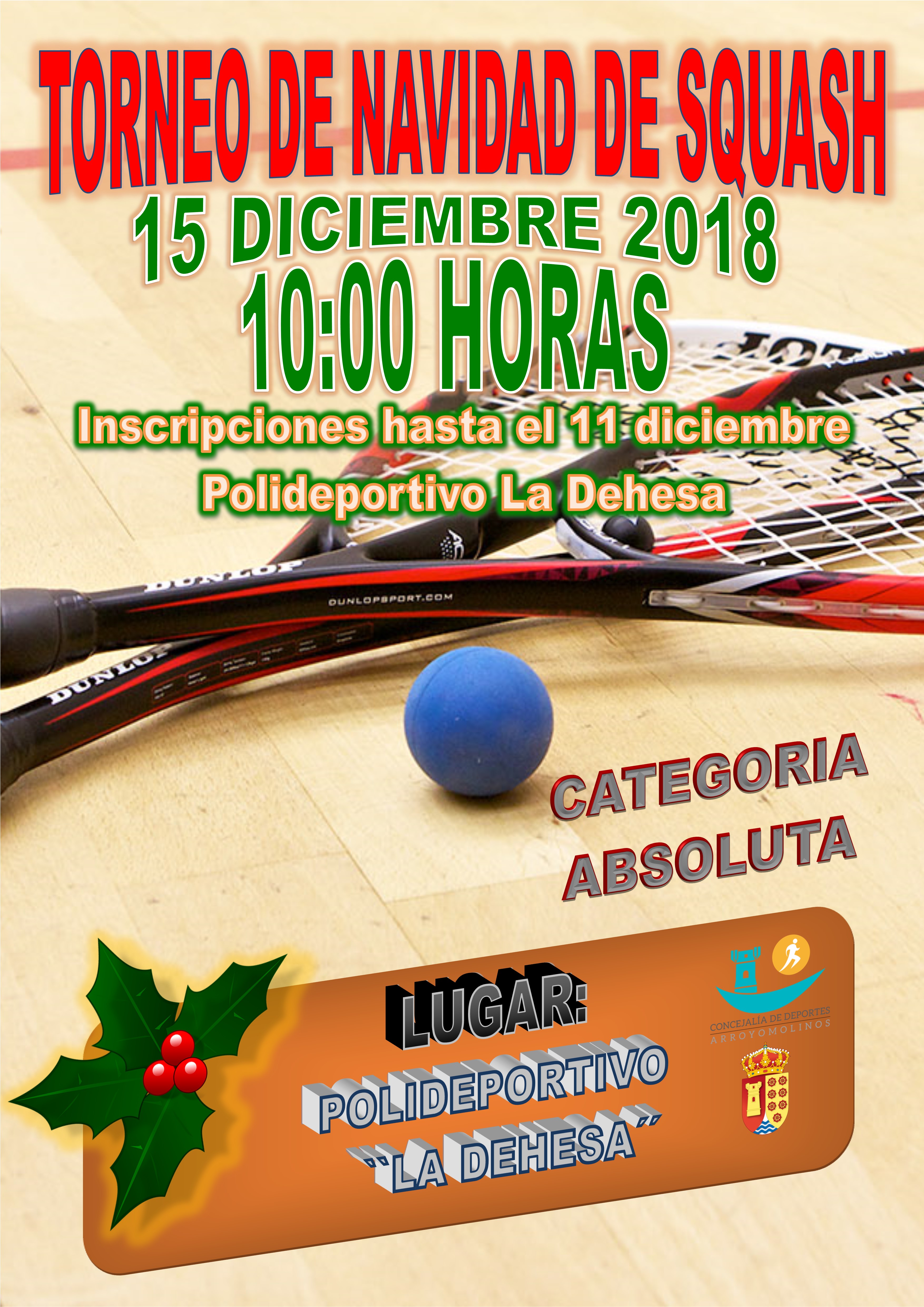Desde las 10:00 horas se organiza en Arroyomolinos el Torneo de Squash de Navidad. El desarrollo del torneo y de la prueba tendrá lugar en el Polideportivo La Dehesa de Arroyomolinos. Inscripciones en Conserjería.