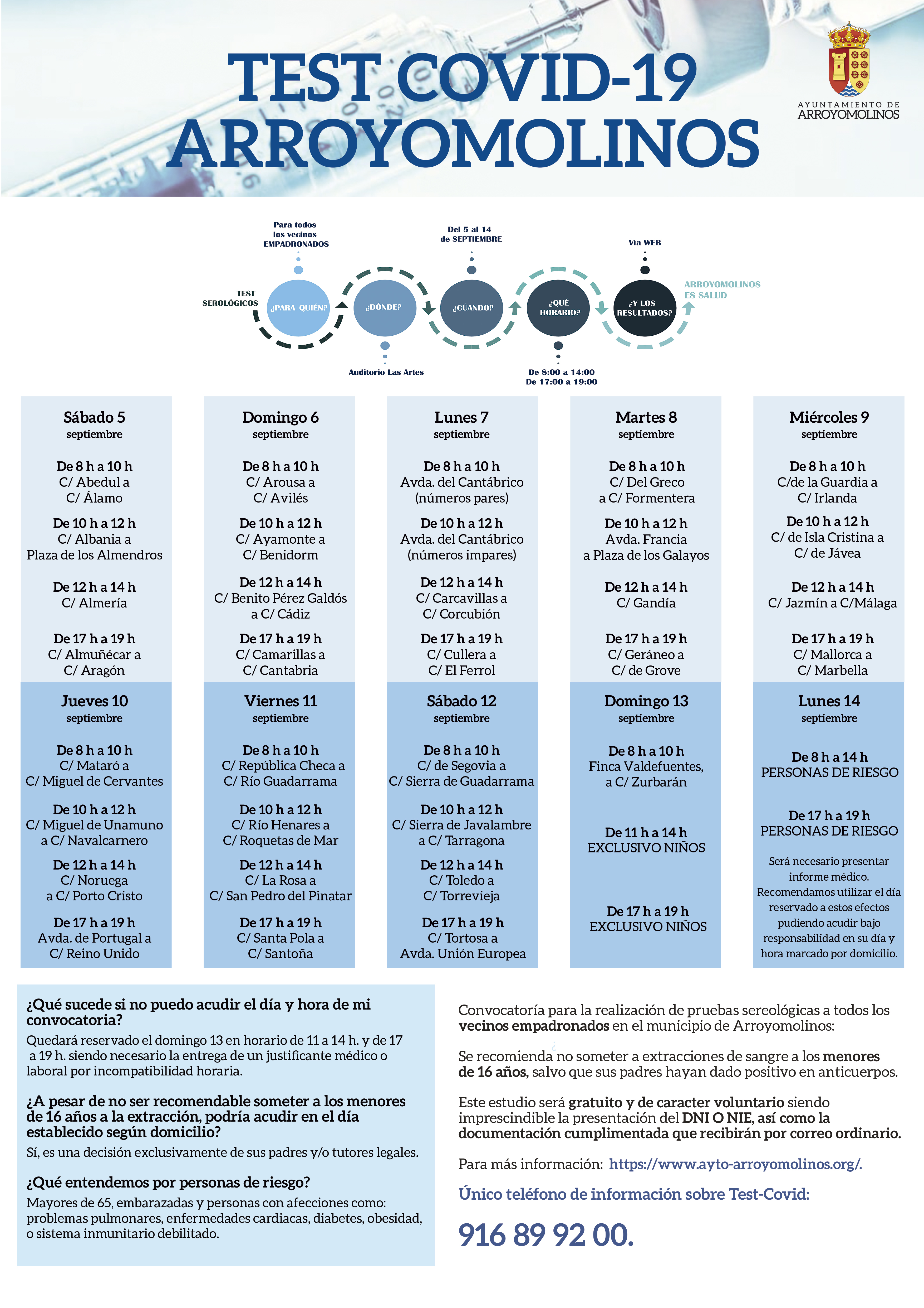 Desde el Ayuntamiento se recomienda no someter a extracciones de sangre a los menores de 16 años salvo que sus padres hayan dado positivo en anticuerpos, aunque deja a elección de los padres que puedan realizar la prueba a los menores en el mismo momento que al resto de la familia. No obstante, reservamos el día 13 de septiembre, entre las 11:00 a 14:00 horas y de 17:00 a 19:00 horas, para este tramo de población. El último día, el 14 de septiembre, se reservará para las personas en situación de riesgo.