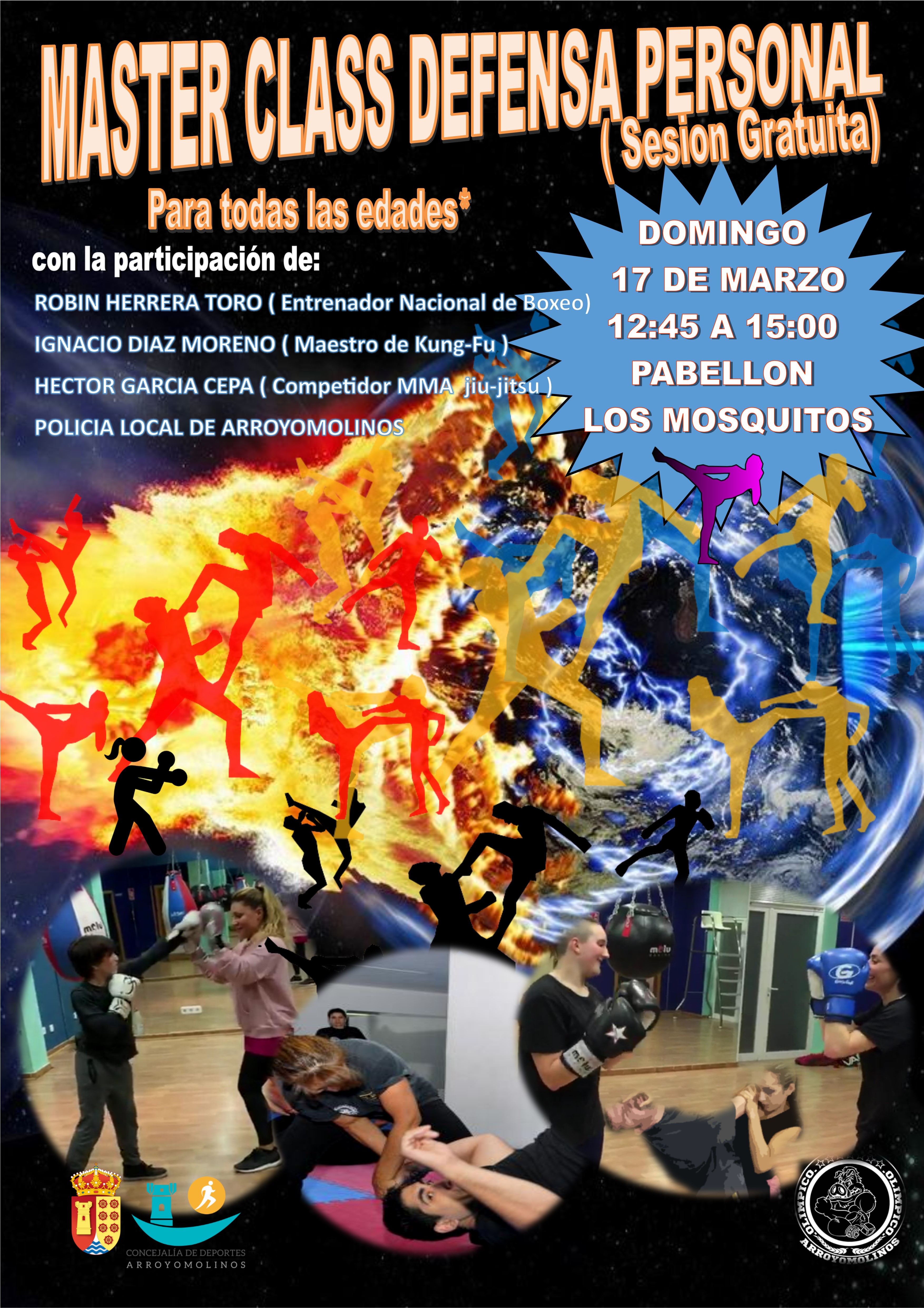 La Concejalía de Deportes de Arroyomolinos ha preparado una Master Class de Defensa Personal en el Polideportivo Los Mosquitos que contará con Robin Herrera, profesor de boxeo, Ignacio Díaz, maestro de Kung-Fu, Héctor García, competidor de Jiu-jitsu y miembros de Policía Local de Arroyomolinos.