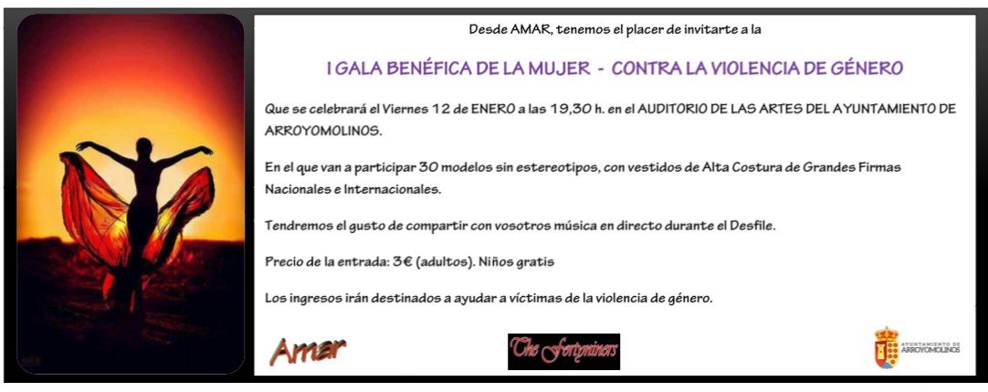 El próximo 12 de enero Arroyomolinos organiza la I Gala Benéfica de la Mujer contra la violencia de género, una Gala promovida por la Asociación de Mujeres para el Apoyo y el Refuerzo (AMAR) y con la colaboración del Ayuntamiento de Arroyomolinos, a través de la Concejalía de Mujer.