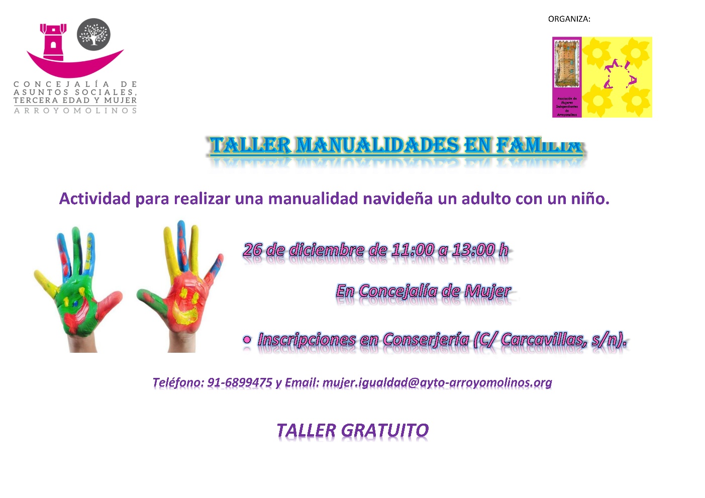 Compartir tiempo entre adultos y niños siempre es una buena iniciativa. En fechas navideñas, quizá, la disponibilidad del tiempo es mayor y que mejor que pasarlo con los más pequeños de la casa haciendo manualidades. Por esta razón AMIA junto con la Concejalía de Mujer de Arroyomolinos organiza este taller de manualidades que es gratuito.