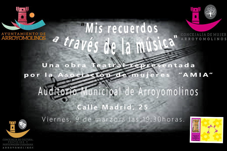 La Asociación de Mujeres Independientes de Arroyomolinos ponen en el escenario del Auditórium de Arroyomolinos interpretación teatral y música con canciones conocidas por todos. Una obra de teatro que nos muestra como las mujeres pueden cumplir y alcanzar todo tipo de metas y anhelos profesionales sin importar su género. “Mis recuerdos a través de la música” no invita al mundo intimista de este grupo de mujeres tras toda una vida de alegrías, objetivos cumplidos y obstáculos por el camino.