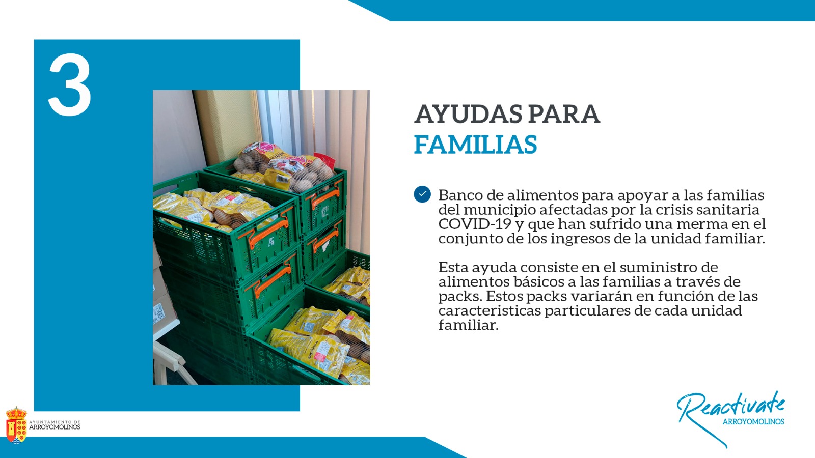 Esta ayuda consiste en el suministro de alimentos básicos a las familias a través de packs, que variarán en función de las características particulares y del número de miembros de cada unidad familiar.