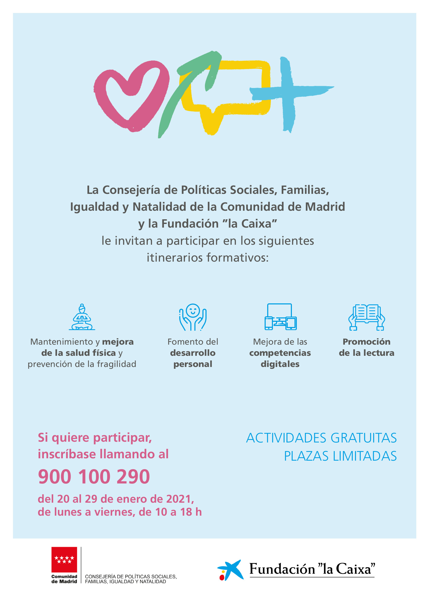 La Consejería de Políticas Sociales, Familias, Igualdad y Natalidad de la Comunidad de Madrid y la Fundación ”la Caixa”le invitan a participar en los siguientes itinerarios formativos: