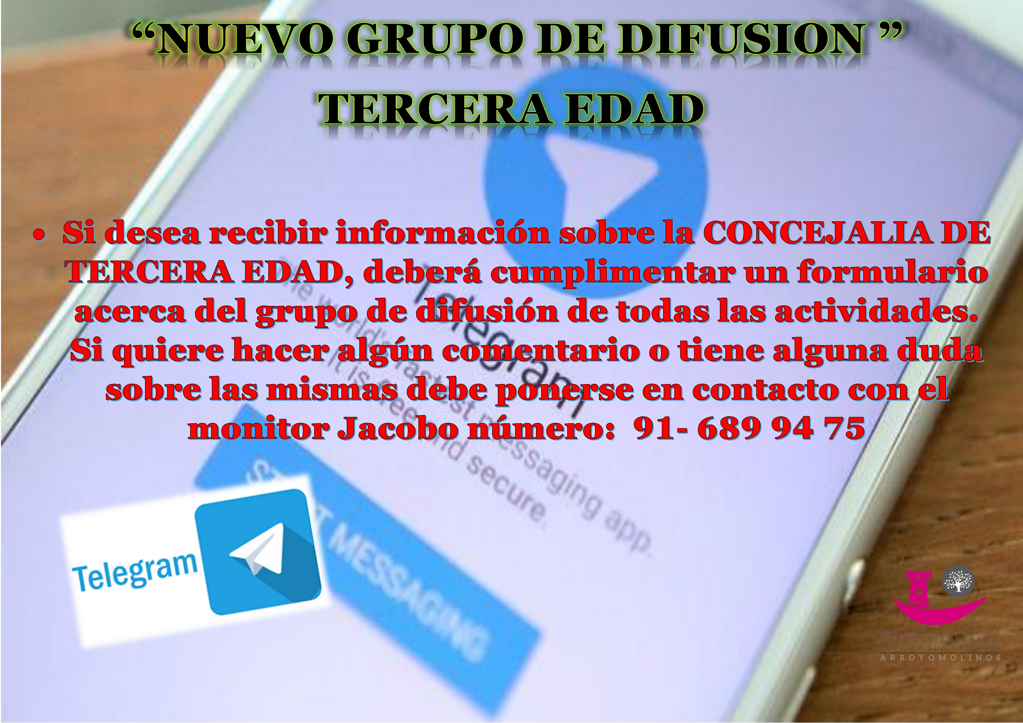 La Concejalía de Tercera Edad de Arroyomolinos pone en marcha un nuevo “grupo de difusión” en Telegram para tener un contacto más directo y ágil con la Tercera Edad de Arroyomolinos.