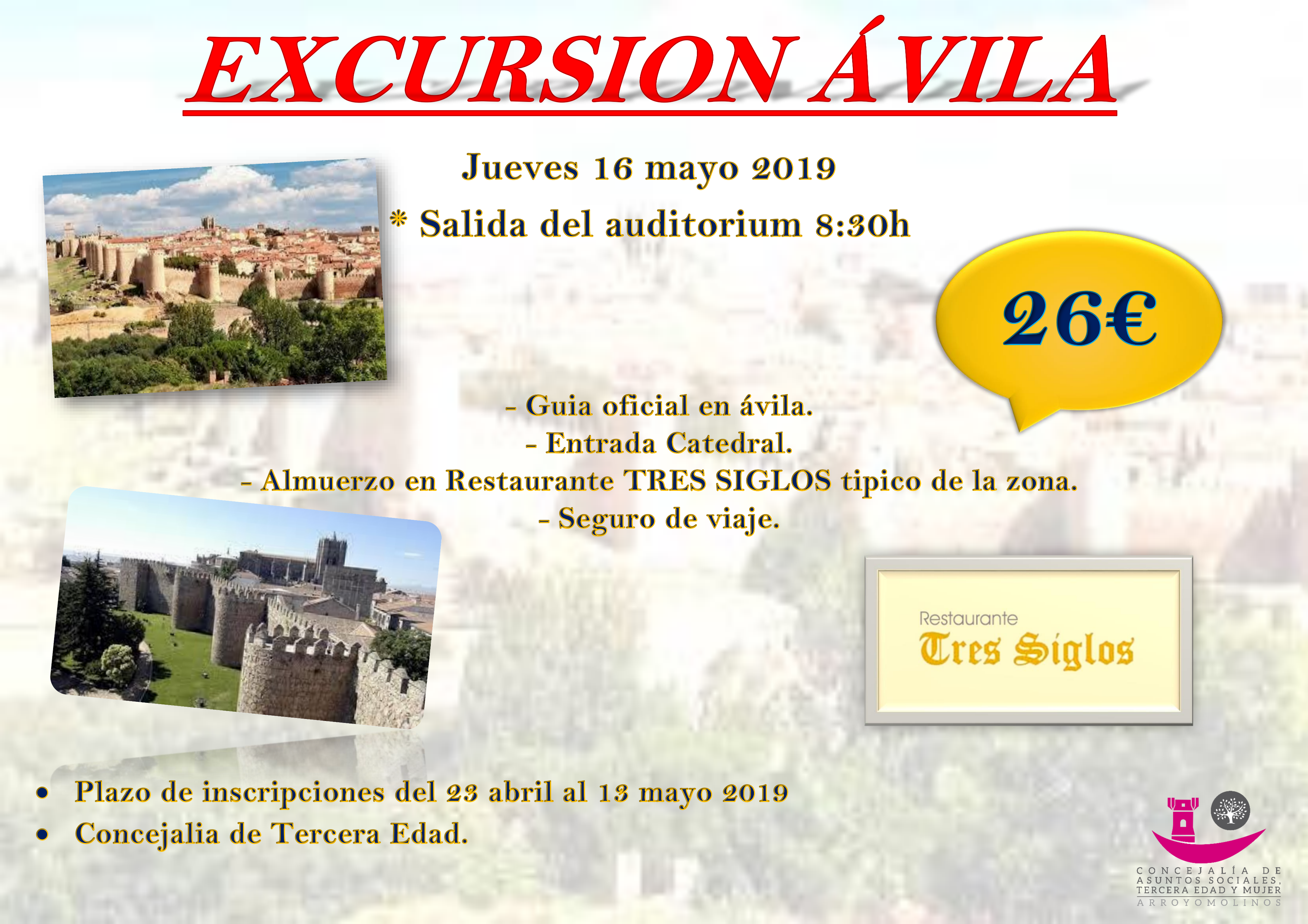 El viaje de nuestros mayores a Ávila tendrá lugar el próximo 16 de mayo. Saldremos juntos a las 8:30 desde el Auditorio. En Ávila contaremos con guía oficial para conocer la historia y todos los secretos de esta ciudad castellana. El viaje incluye la entrada a la Catedral del Salvador de Ávila, que está considerada la primera catedral gótica de España. El almuerzo lo realizaremos en el restaurante Tres Siglos. El precio del viaje es de 26 euros
