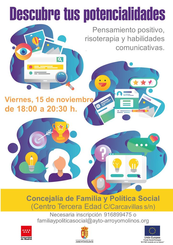 El próximo 15 de noviembre, entre las 18:00 y las 20:30 horas, celebramos un taller abierto a todos los vecinos del municipio, sobre el pensamiento positivo, risoterapia y habilidades comunicativas, con dinámicas grupales para reforzar la autoestima.