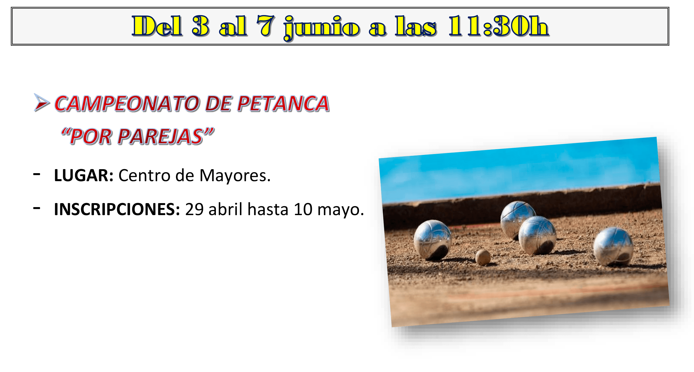 La mañana del lunes 3 de junio comenzaremos en el Centro de Mayores de Arroyomolinos con el Campeonato de Petanca de Arroyomolinos. Un evento organizado por la Concejalía de Tercera Edad de Arroyomolinos dentro de la programación previa de las Fiestas del Corpus 2019. El campeonato se disputará desde las 11:30 de la mañana entre el 3 y el 7 de junio y se competirá por parejas.