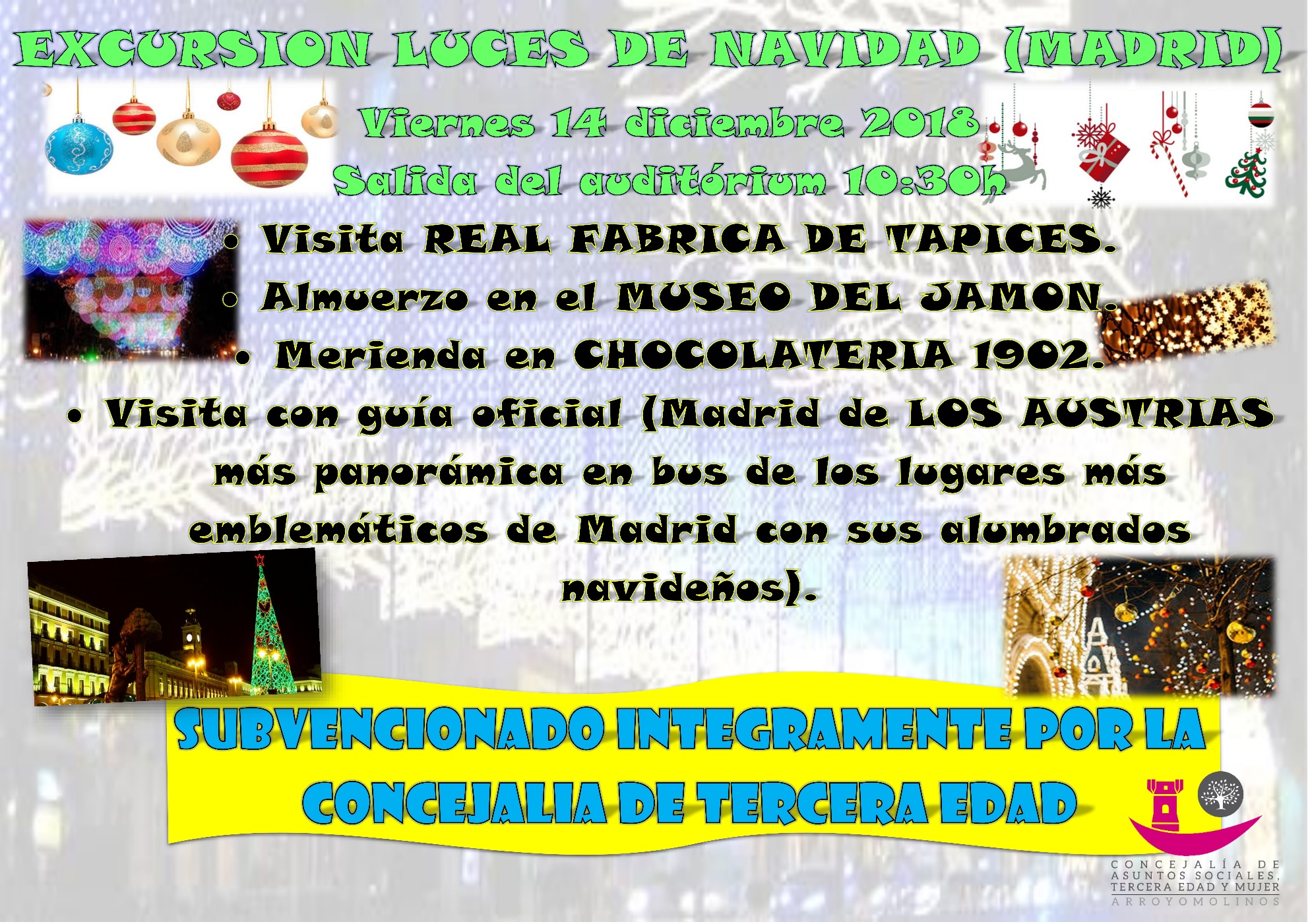 En esta ocasión, además, nuestros mayores visitarán, la Real Fábrica de Tapices. También con un guía recorreremos todos los rincones históricos del Madrid de los Austrias y nos ilustrará sobre las curiosidades de edificios y calles. La iluminación navideña de las calles de Madrid la disfrutaremos desde un autobús panorámico. Nuestros mayores almorzarán en Madrid y merendarán un buen chocolate con churros. Una jornada gratuita para disfrutar entre todos. Saldremos a las 10:30 de la mañana del Auditorio de Arroyomolinos y la inscripción se realiza en el Centro de Mayores.