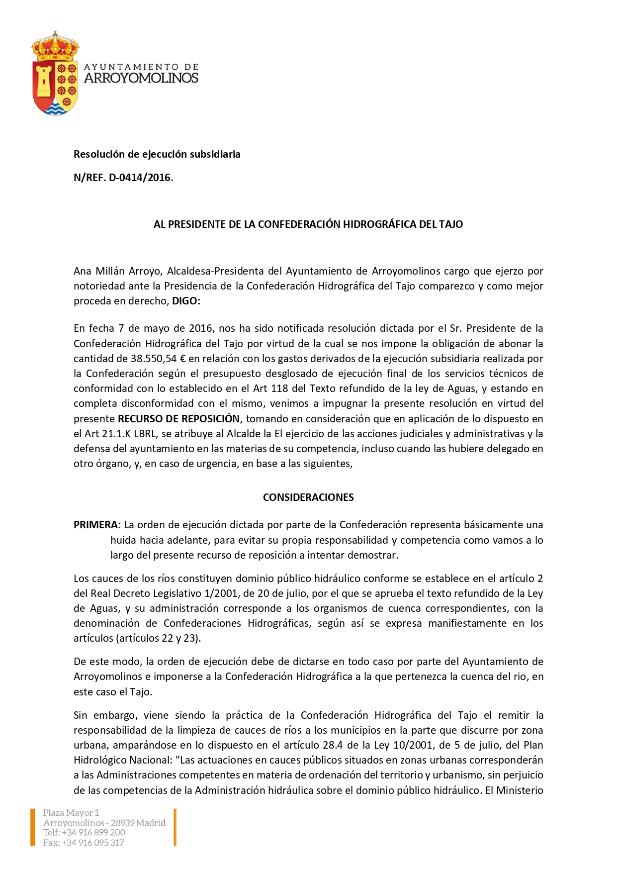 El Ayuntamiento de Arroyomolinos recurrirá, a través de sus servicios jurídicos, la apertura del expediente de la Confederación Hidrográfica del Tajo (CHT) que exige que sean los propios municipios por los que transcurre el río Guadarrama los que se hagan cargo del coste de su limpieza y mantenimiento.