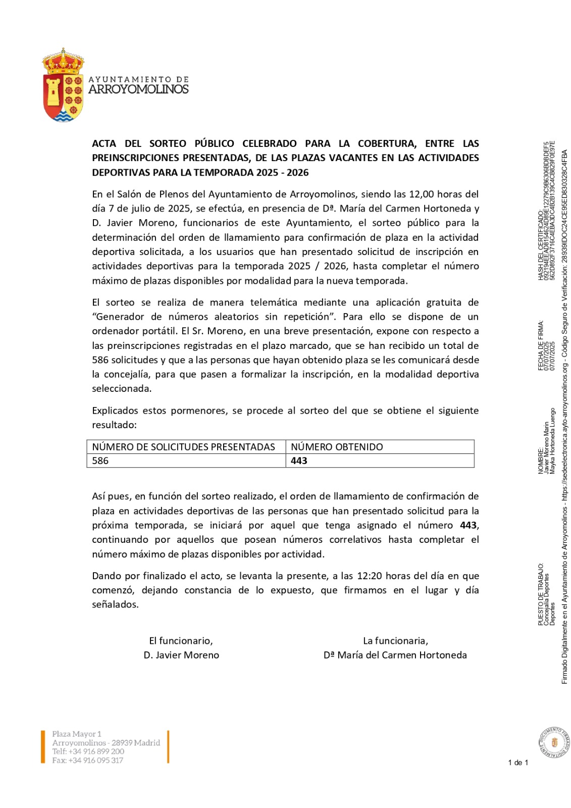 El Ayuntamiento de Arroyomolinos informa de que este 7 de julio, a las 12.00 horas, se ha procedido al sorteo público la determinación del llamamiento para la adjudicación de las plazas de las actividades deportivas, con un total de 292 vacantes en las distintas modalidades.