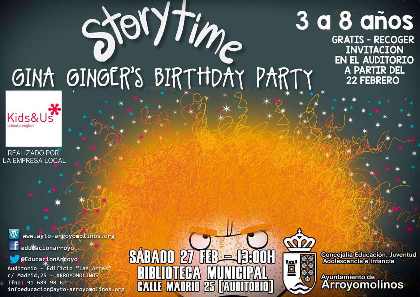 El sábado 27 de febrero a partir de las 13:00h. de la mañana en la Biblioteca Municipal, vuelve Storytime con una nueva sesión especialmente dirigida a todos los niños de 3 a 8 años: Gina Ginger's Birthday Party.