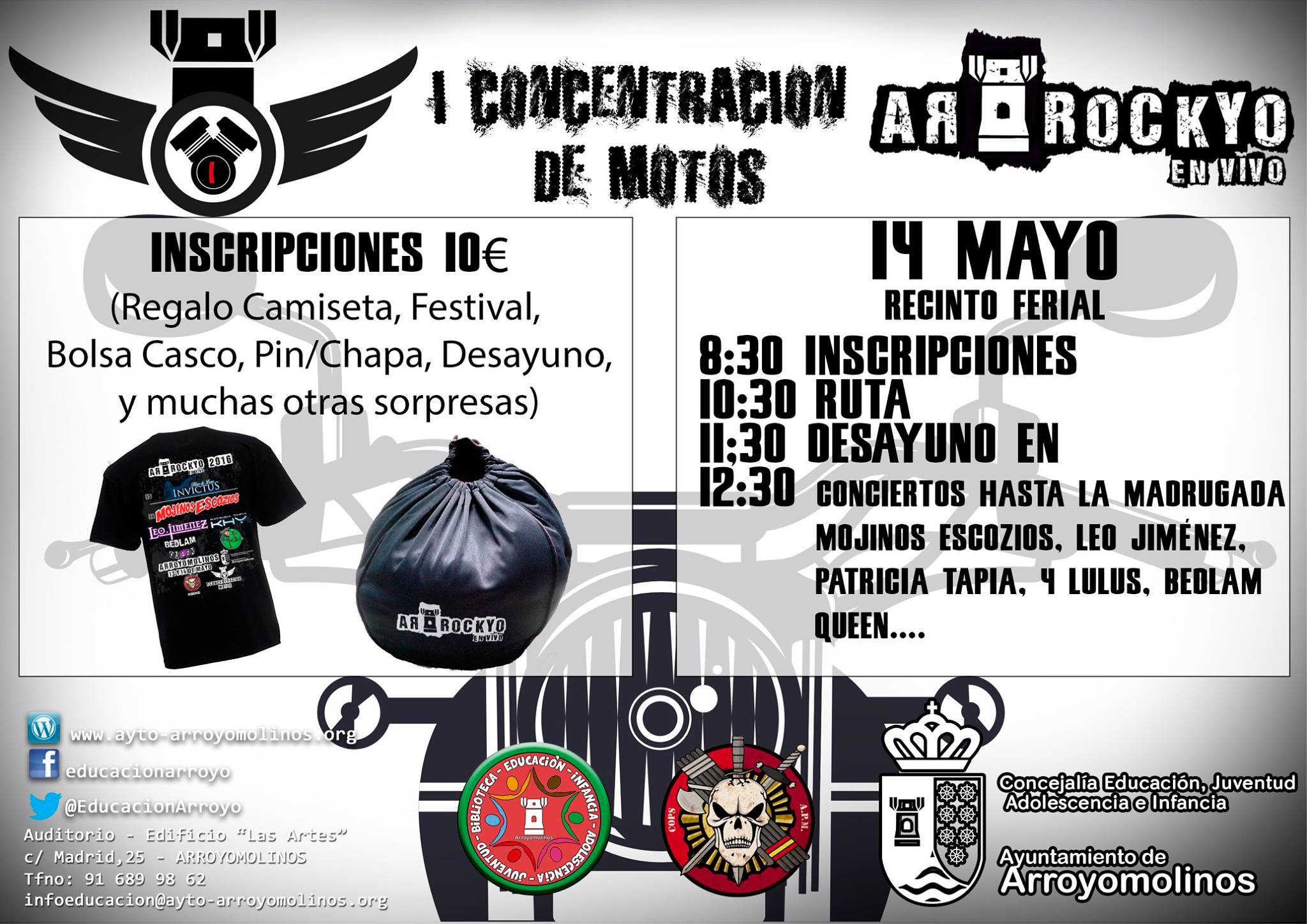 El día 14 de mayo a partir de las 8:30h. tendrá lugar la I Concentración Motera en Arroyomolinos, englobada dentro del Festival Arrockyo En Vivo y que contará con la siguiente agenda: