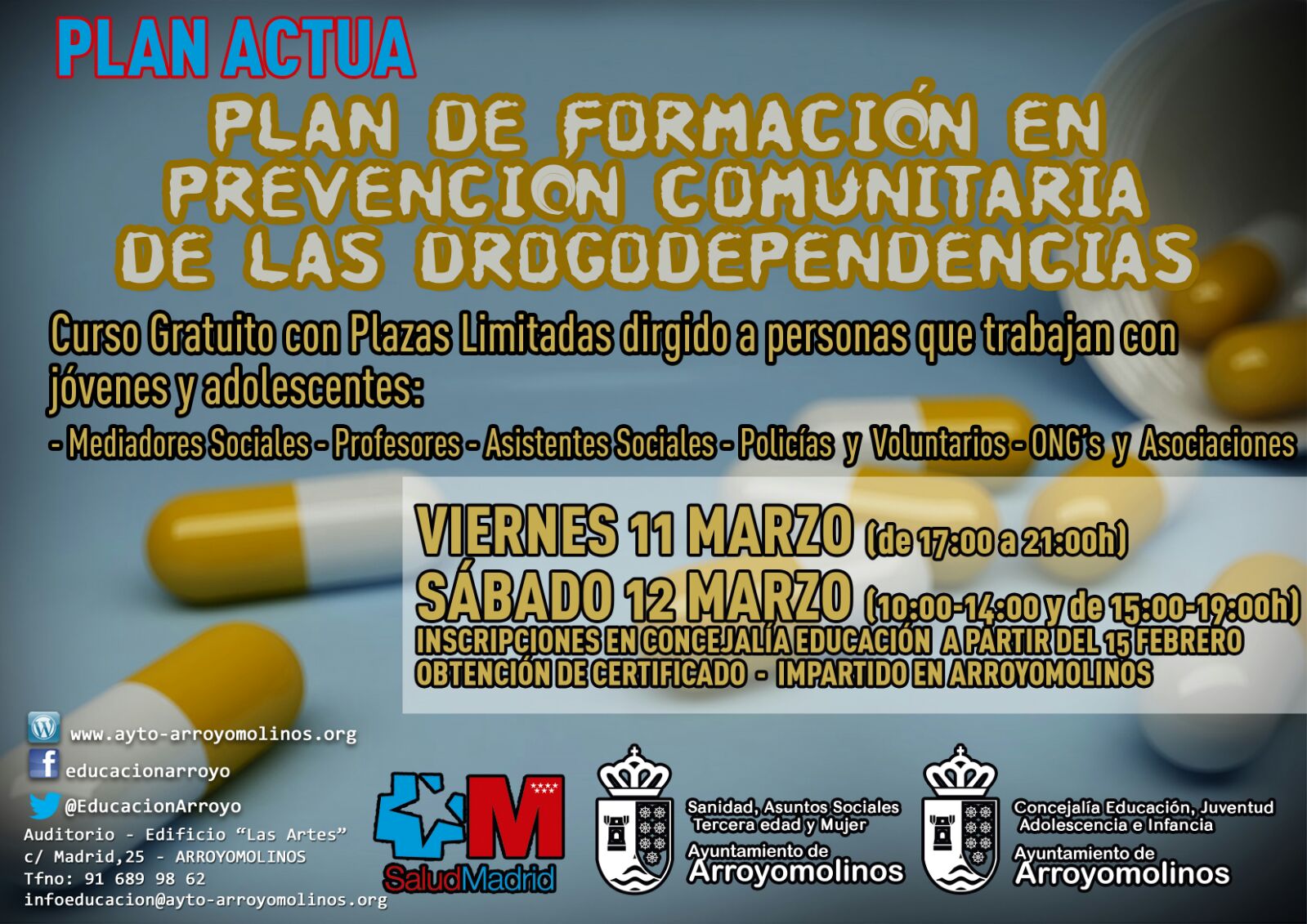 A partir del viernes 11 de marzo a las 17:00h. darán comienzo en las aulas de formación del Ayuntamiento de Arroyomolinos, un Plan de formación e prevención comunitaria de las drogodependencias especialmente dirigido a mediadores sociales, profesores, asistentes sociales, policías y voluntarios, ONG y asociaciones.