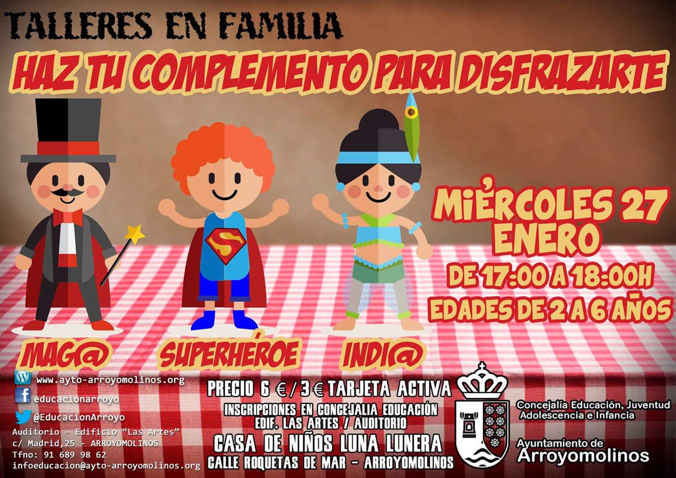 Ahora que se acercan las fechas de celebración del Carnaval, el Ayuntamiento de Arroyomolinos a través de su Concejalía de Educación, Juventud, Adolescencia e Infancia organiza los talleres en familia Haz tu complemento para disfrazarte especialmente dedicado a niños de 2 a 6 años.