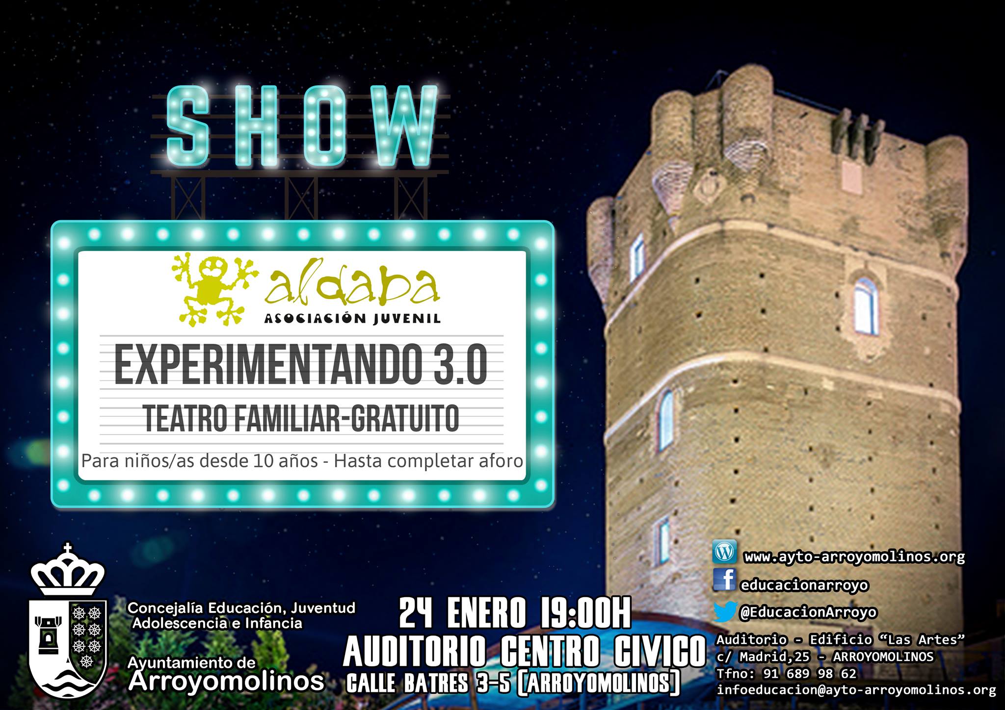 El domingo 24 de enero, en el Auditorio del Centro Cívico de la calle Batres (núm. 3 a 5), teatro familiar gracias a la Asociación juvenil Aldaba, que presenta su espectáculo Experimentando 3.0.