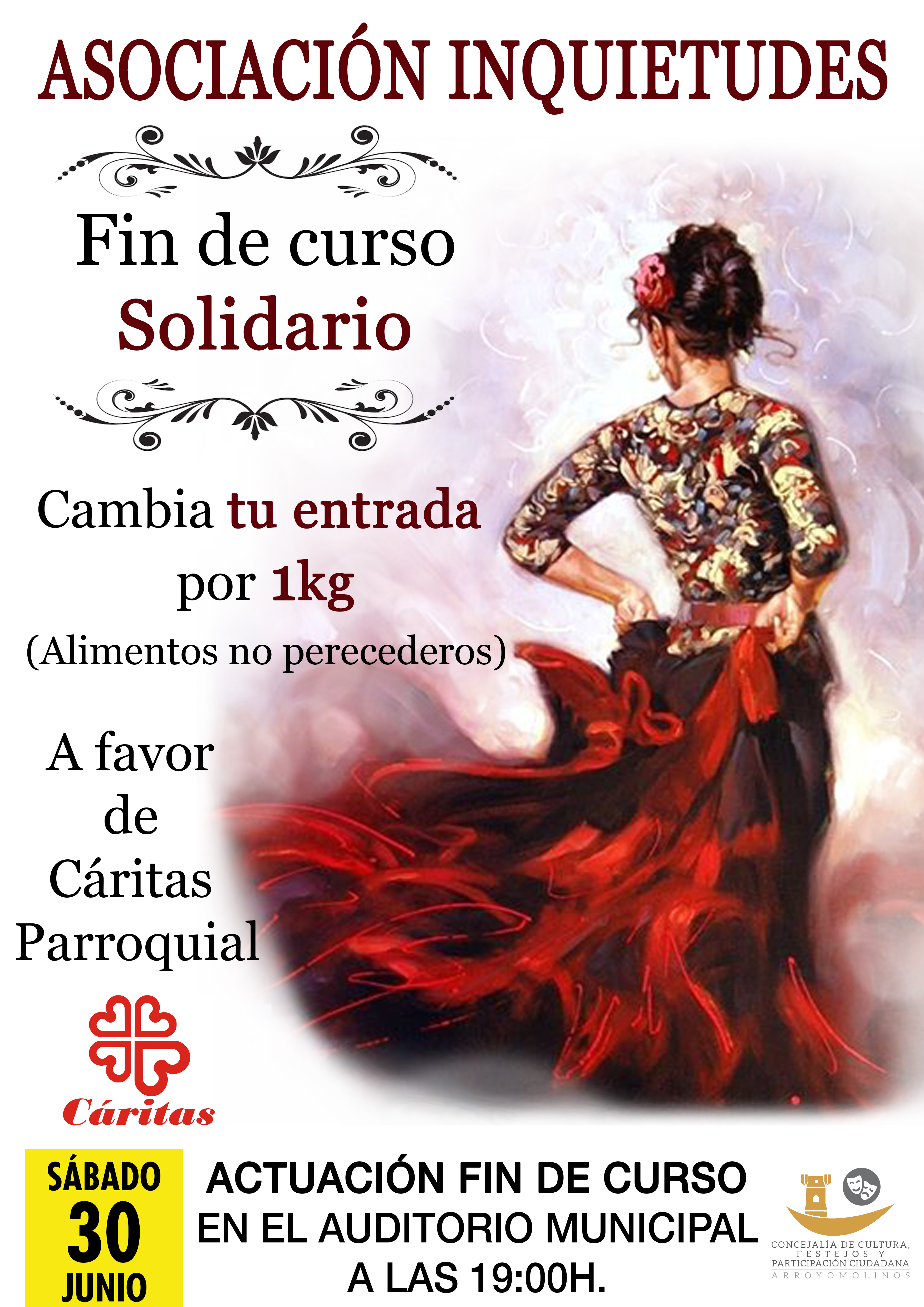 La cultura y la solidaridad se dan la mano gracias a la Asociación Inquietudes en el Auditórium de Arroyomolinos. Desde las 19:00 horas del sábado 30 de junio la danza y el baile pondrán su granito de arena para ayudar a quienes más lo necesitan. La Asociación Inquietudes celebra su Fin de Curso pensando en los demás. Para asistir a la exhibición de baile que arrancará a las 19:00 horas solamente tenemos que llevar, al menos, 1 kilo de alimentos no perecederos por cada entrada que canjeemos en el Auditórium de Arroyomolinos.