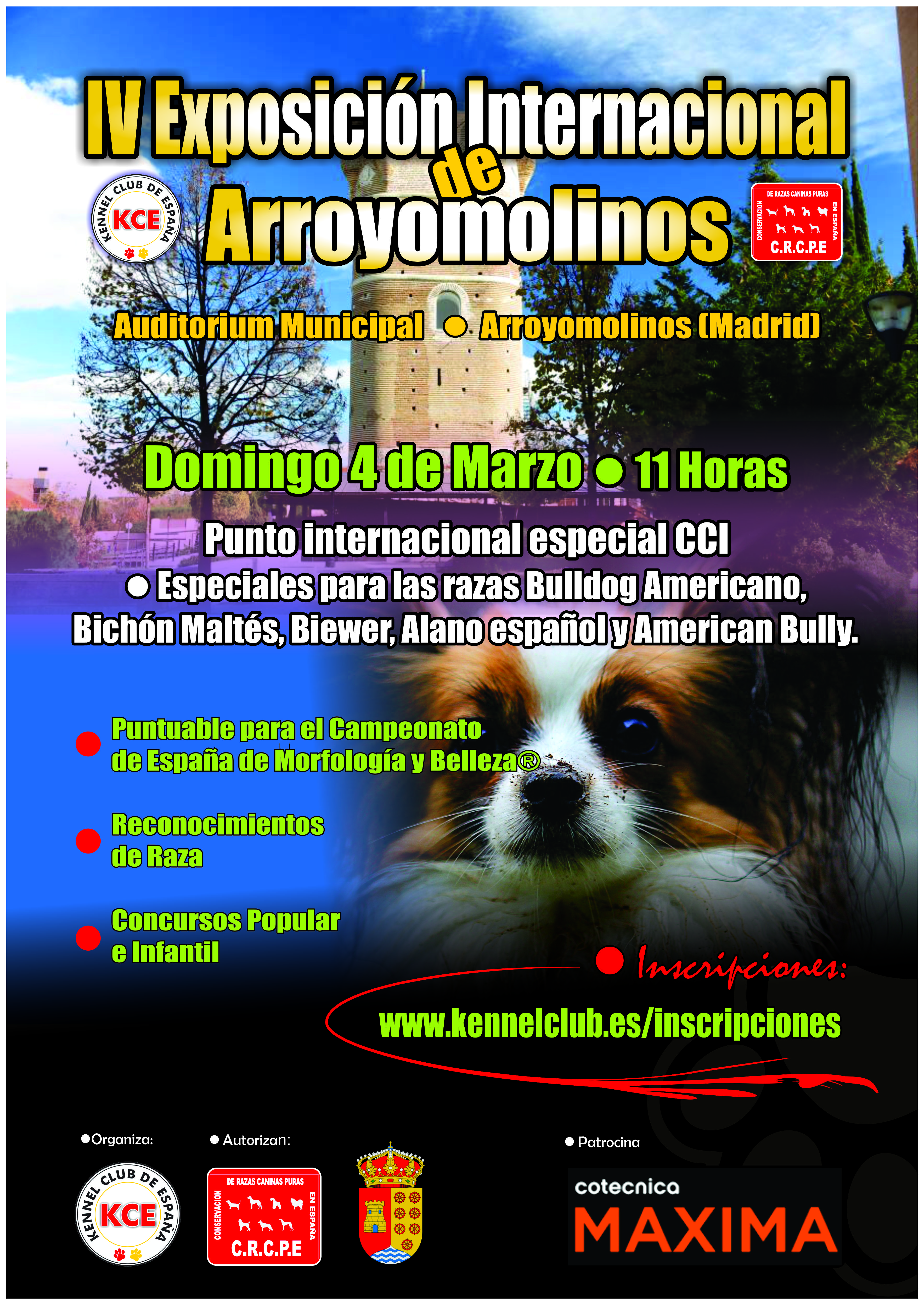 Los perros de raza tienen una cita en Arroyomolinos este finde semana gracias a la IV Exposición Internacional de Arroyomolinos. Una cita puntuable para el Campeonato de España de Morfología y Belleza. La cita es organiza por Kennel Club España en colaboración con el Ayuntamiento de Arroyomolinos, a través de la Concejalía de Deportes. Kennel Club España es una asociación de criadores de razas puras de perros que agrupa a numerosas asociaciones.
